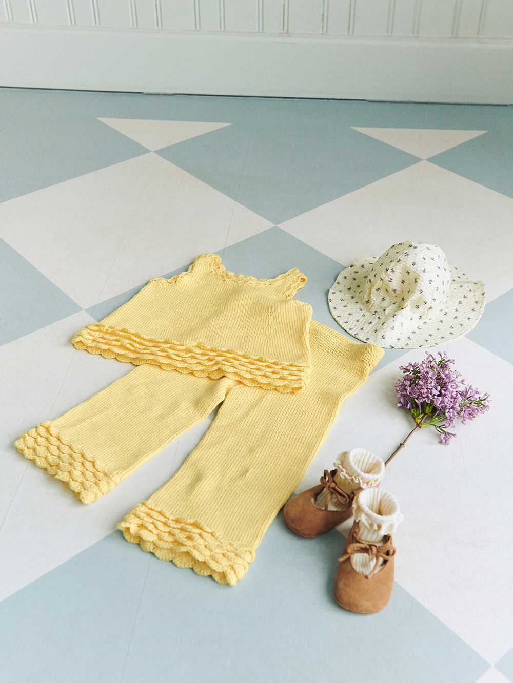 Rosette Top Baby strikkes ovenfra og ned og formes med økninger til en søt A-fasong. Under montering hekles det blondekanter nede på toppen som legger seg som søte små kapper. Til slutt hekles det en omgang med blondekant rundt ermehull og hals.