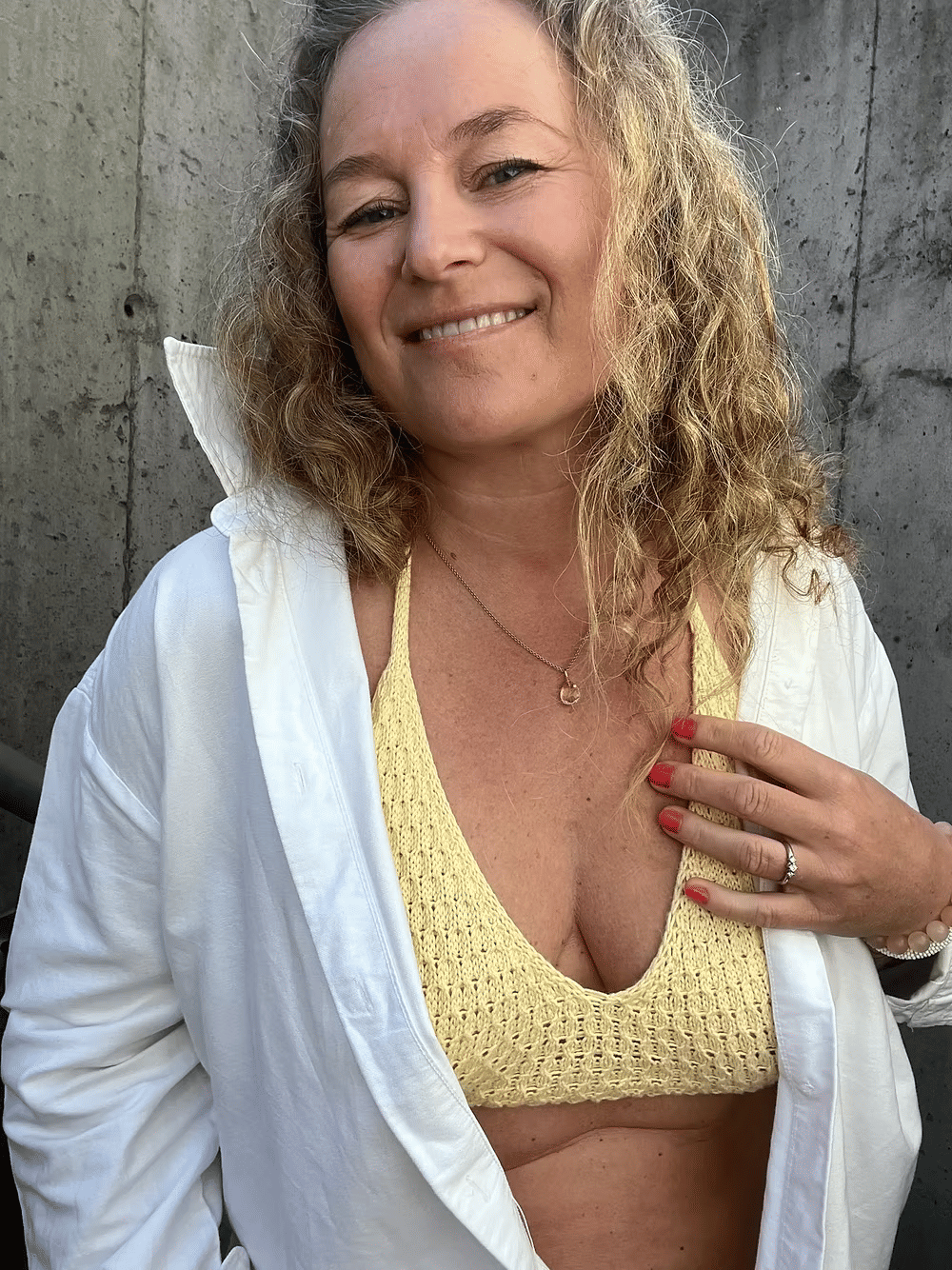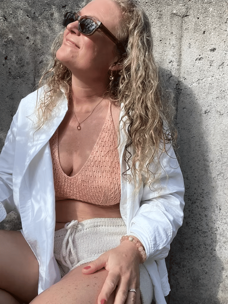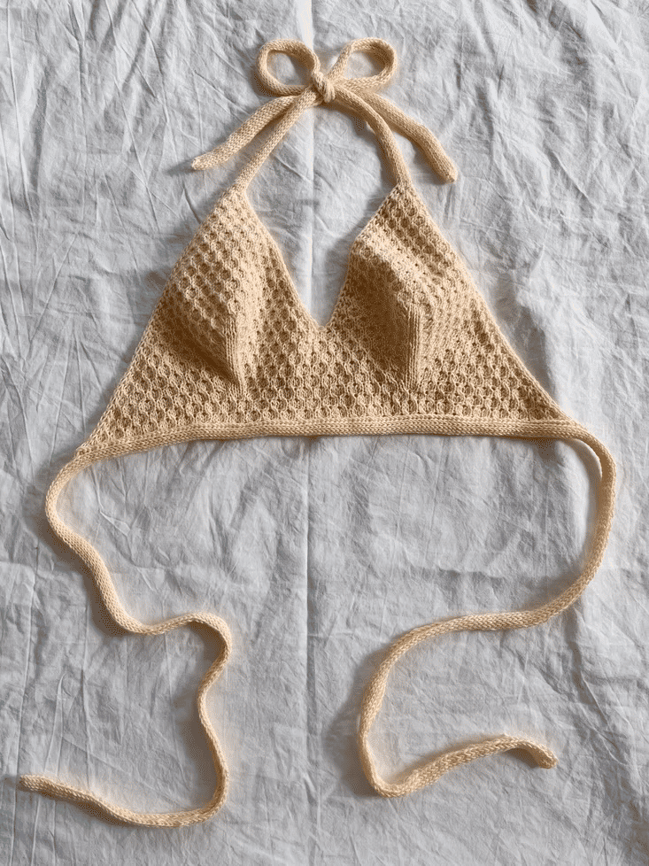 Honey Bikini Top er en strukturstrikket bikinitopp som strikkes ovenfra og ned. Toppen strikkes i Tynn line eller Cotton merino fra Knitting for Olive.