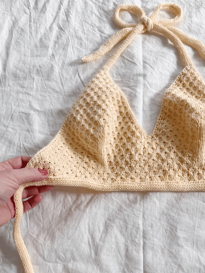 Honey Bikini Top er en strukturstrikket bikinitopp som strikkes ovenfra og ned. Arbeidet begynner med to like trekanter som danner cupene, før de sammenføyes og det strikkes med fellinger og økninger for å forme plagget videre. En tykk snor strikkes og brukes både til å felle av maskene og formes til en avsluttende snor i samme lengde. Til slutt strikkes stroppene som gir en ekstra søt liten detalj til bikinien. En kreativ og sommerlig oppskrift som både kan brukes som bikini og som bh! 🌞🧶