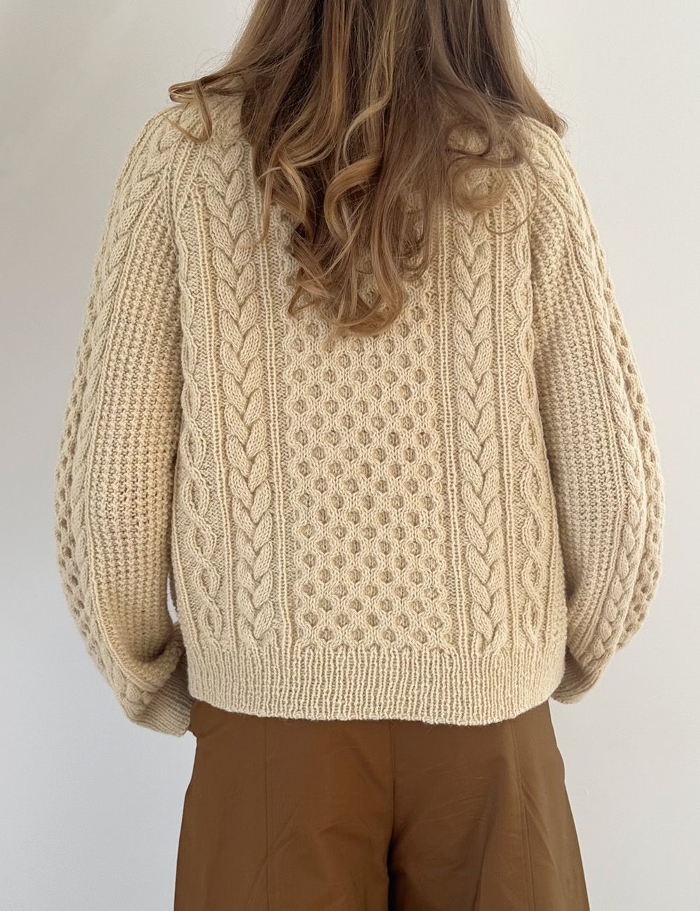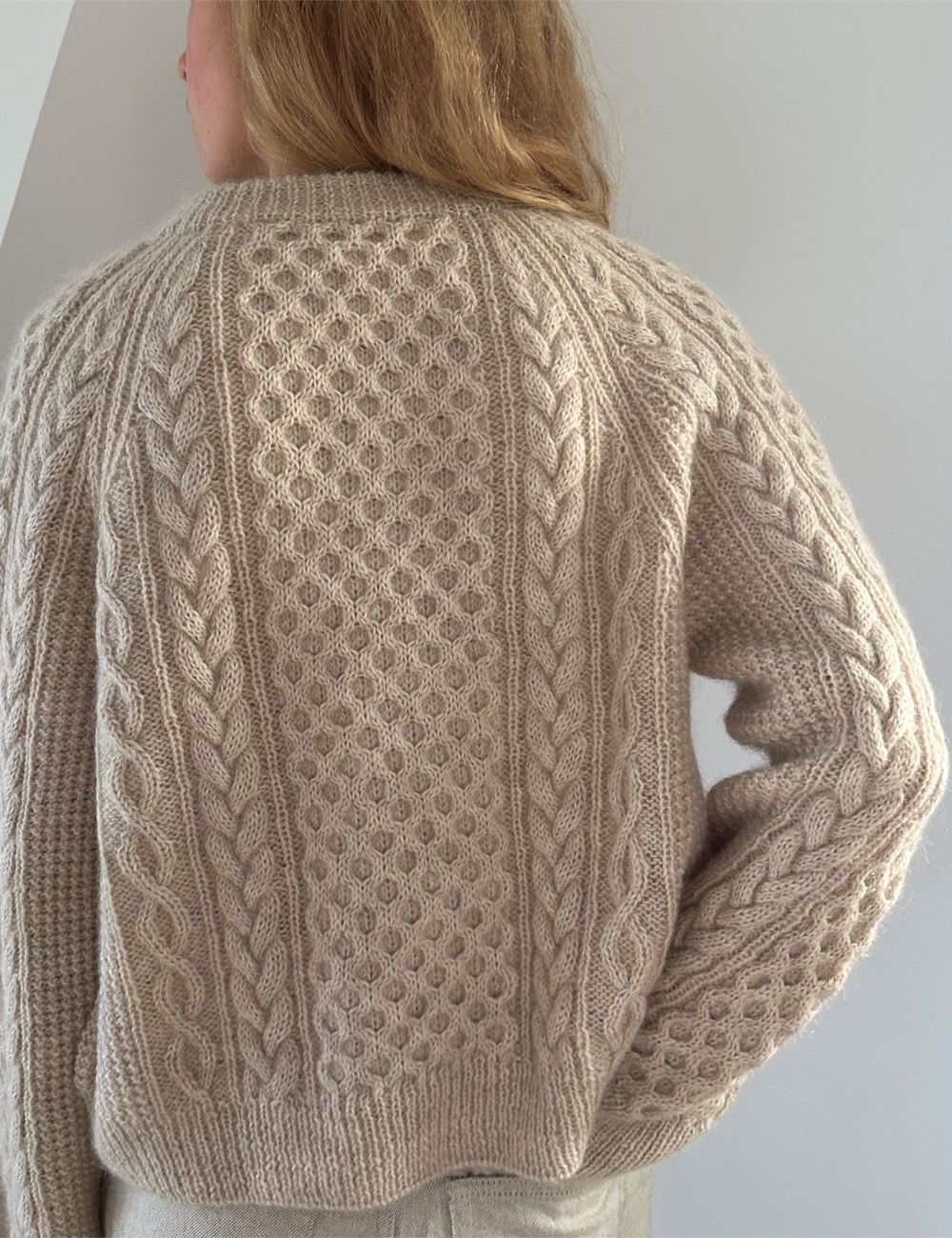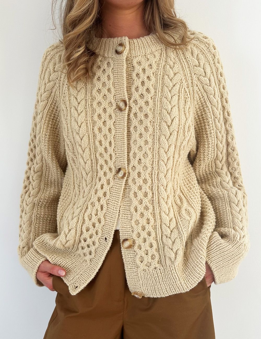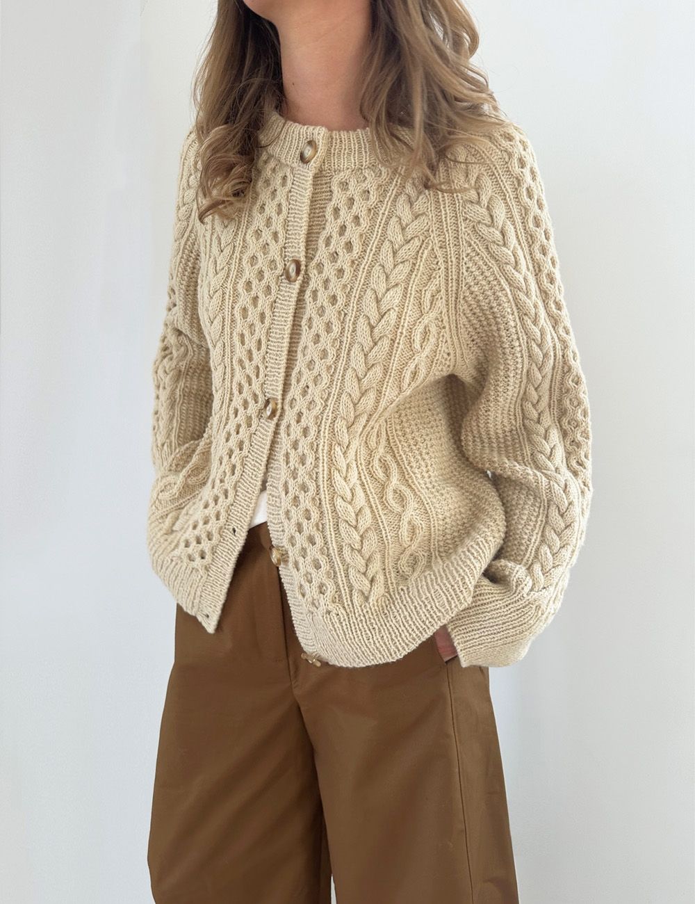 Cara Cardigan er ment å ha en bevegelsesvidde på ca. 14-20 cm. Fasongen er fleksibel, så velg en størrelse større eller mindre hvis du ønsker mer eller mindre bevegelsesvidde. Det er også enkelt å justere lengden. På bildene er Cara Cardigan vist med en bevegelsesvidde på ca. 18 cm.