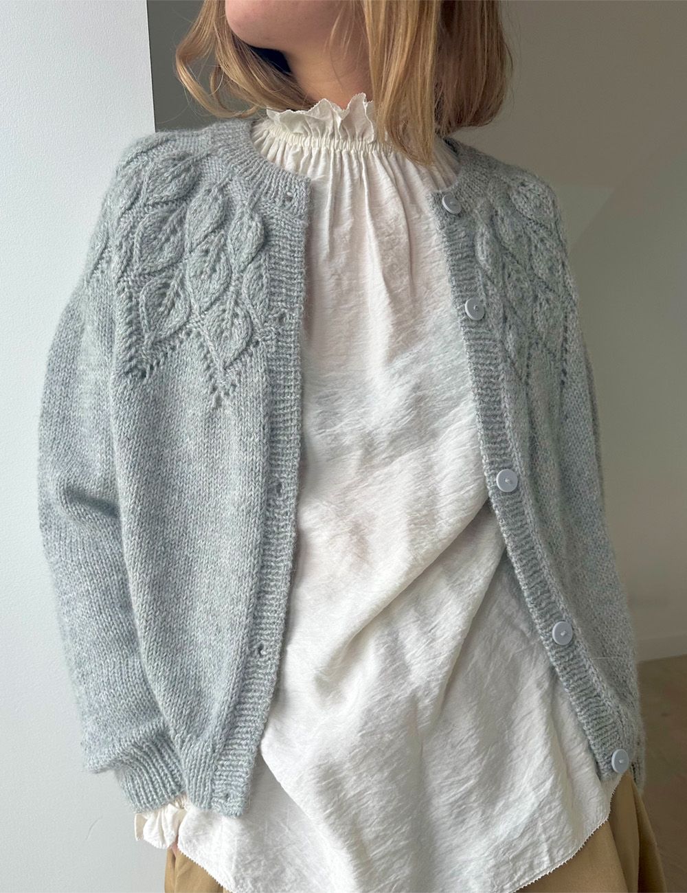 Bladmønsteret på bærestykket er morsomt å strikke, og det gir også en fin passform fordi kombinasjonen av rett- og vrangmasker er så elastisk. Ella Cardigan er strikket ovenfra og ned, og er strikket høyere bak enn foran.