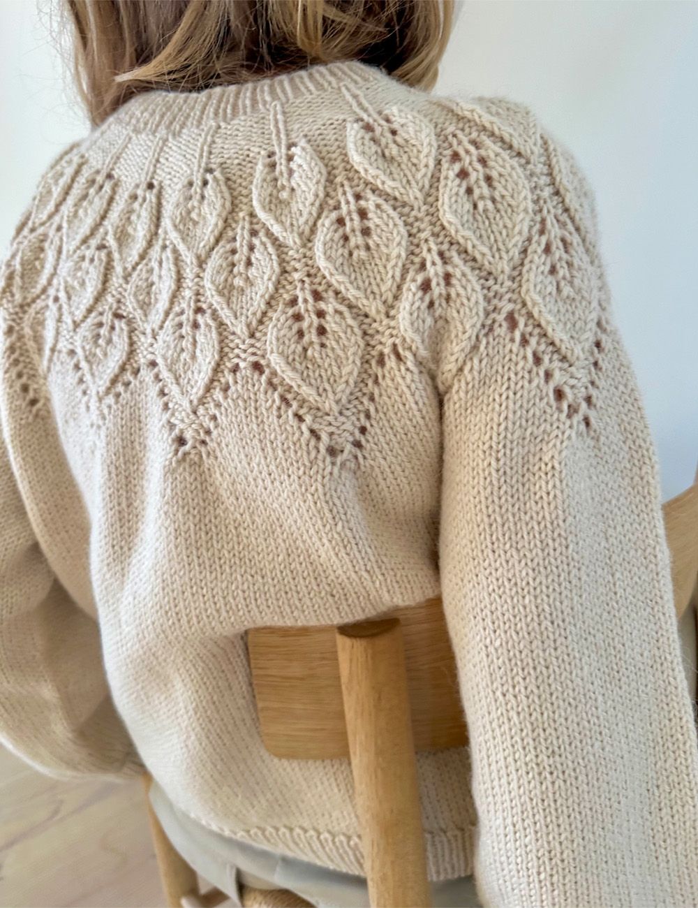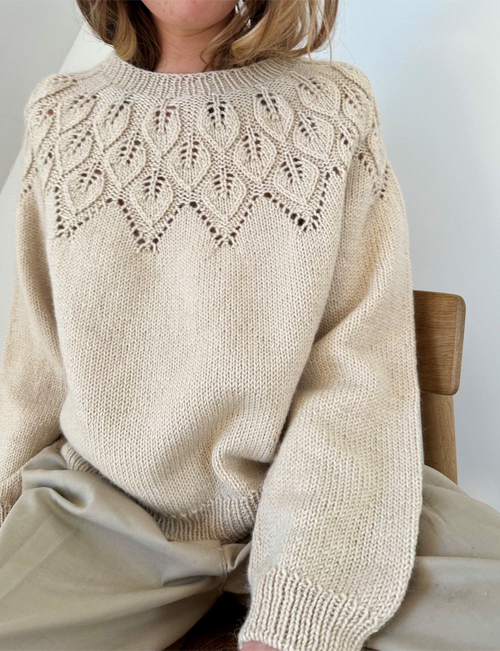 Det bladmønstrede bærestykke er underholdende å strikke og gir samtidig en fin pasform, fordi kombinasjonen av rett- og vrang-masker er så elastisk. Ella Sweater er strikket ovenfra, og er strikket høyere i nakken ved hjelp av vendepinder.