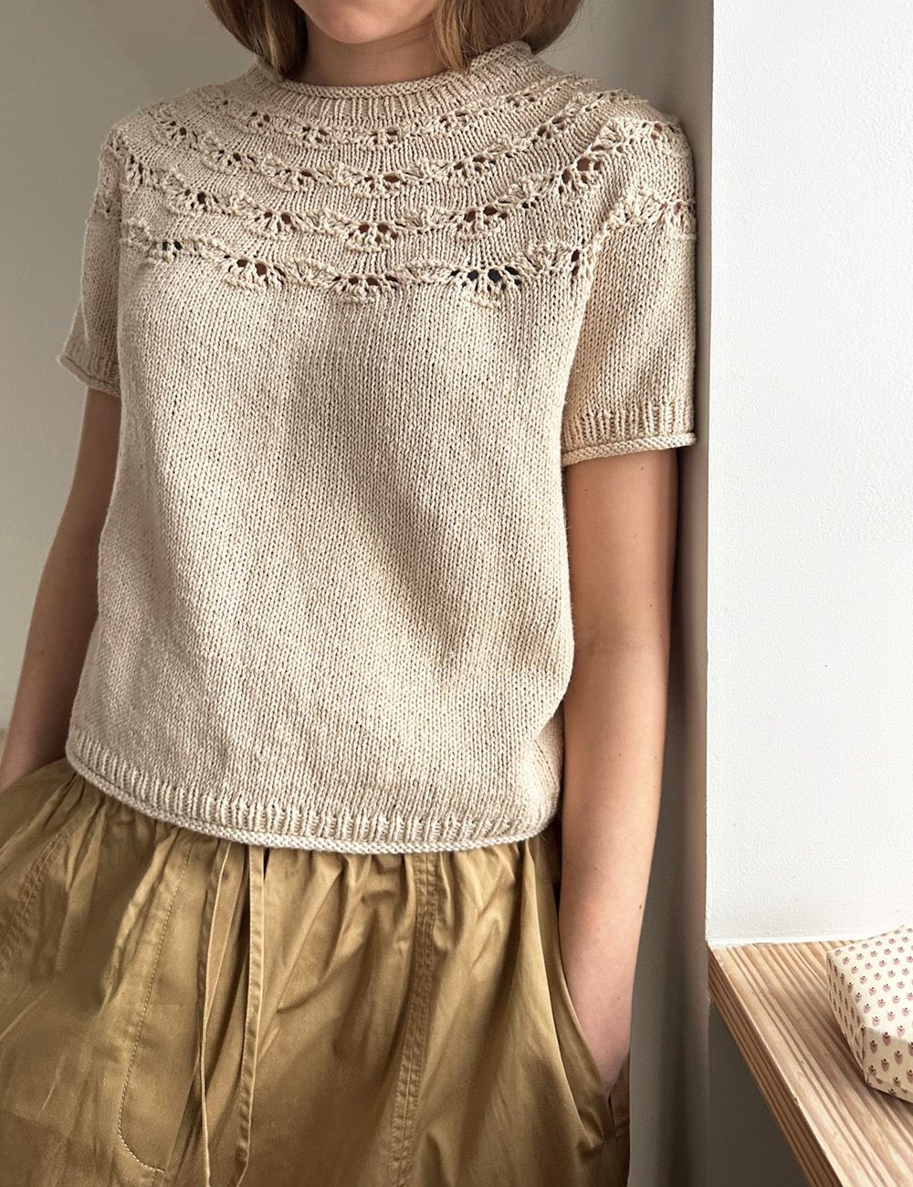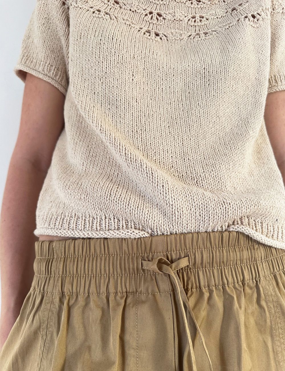 Noomi Tee strikkes ovenfra og ned, og halsutskjæringen formes med vendepinner etter at halskanten er strikket.
