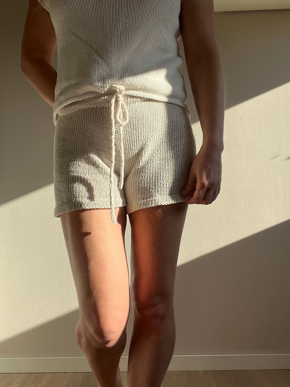 Shortsen strikkes ovenfra og ned i glattstrikk. En starter med å strikke en fin brettekant, deretter strikkes det vendepinner for å få god passform. Det strikkes økninger jevnt fordelt i buksen for å oppnå vidde og fellinger på buksebeina. Hele shortsen strikkes i glattstrikk, foruten omgangen med vrangmasker for å få en fin, markant brettet kant. Brettekanten på beina strikkes dobbelt, før den brettes og sys fast. Strikk evt. en i-cord-avslutning om du ønsker det. Helt til slutt strikkes det opp en lang i-cord snor som en trer inn i brettekanten.