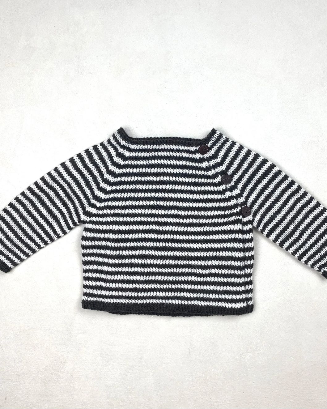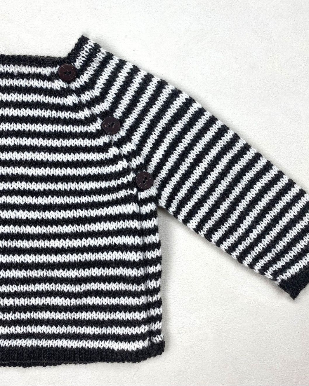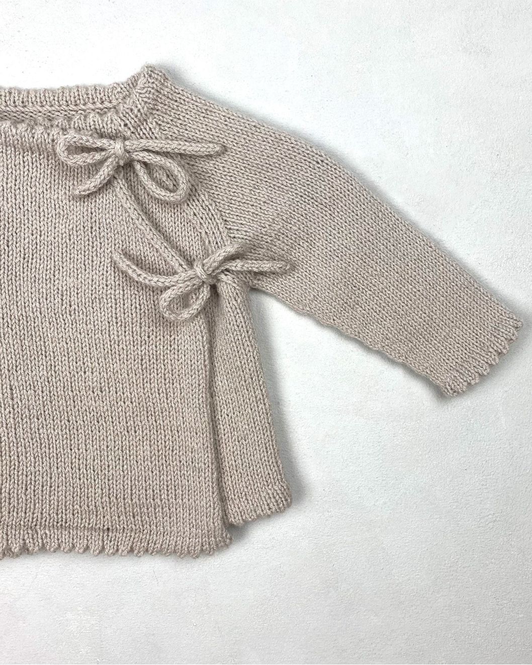 Olives Slå Om er en enkel omslagsbluse til babyer og små barn. Blusen kan enten strikkes med knytebånd eller knapper.