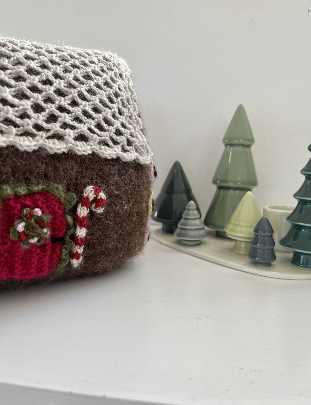 Konstruksjon Først strikkes bunnen i rillestrikk. Deretter strikkes det opp masker langs sidene på bunnen, og hus og tak strikkes herfra. Det etterlates et hull langs den ene kortsiden slik at huset kan fylles med fiberfyll når det er tovet. Den lille åpningen sys sammen til slutt når huset er pyntet. Dekorasjonene består av både strikkede og heklede deler.