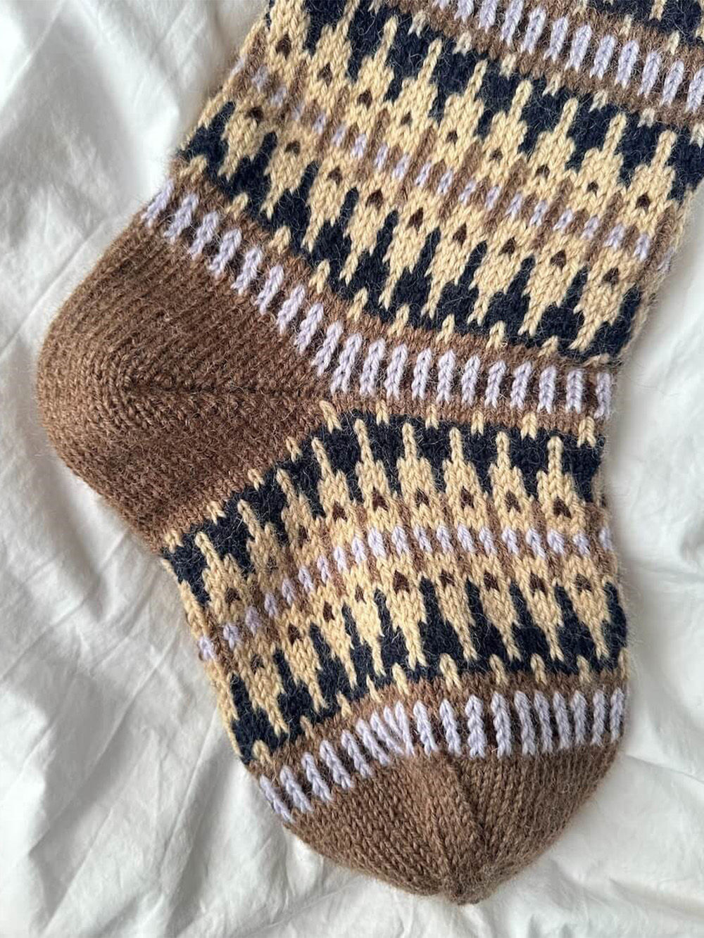 Celeste Julestrømpe strikkes fra skaftet og ned mot tåen. Øverste vrangbordkant, hæl og tå strikkes ensfarget, mens resten strikkes i Jacquardstrikk med 5 forskjellige farger. Hælen formes med vendepinner.