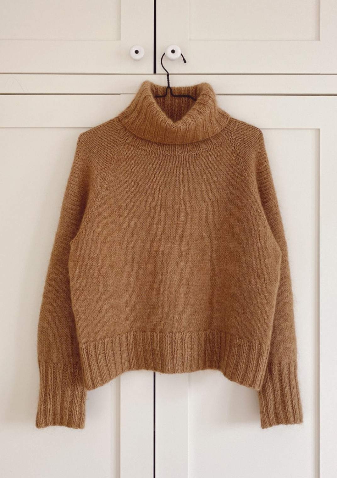 Caramel Sweater strikkes ovenfra og ned med raglanøkninger på bærestykket. Caramel Sweater har en lang polohals i dobbel vrangbord, og halsutskjæringen formes ved hjelp av forkortede pinner/vendepinner i overgangen mellom polohals og bærestykke. Det strikkes også dobbel vrangbord på ermer og nederst på bolen. Disse vrangbordkantene vil først trekke seg sammen, men de vil i vask/ved damping/blokking åpne seg opp. Caramel Sweater er monteringsfri.
