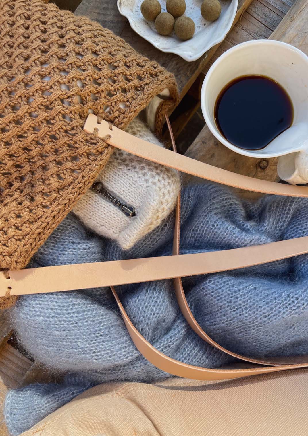 French Market Bag strikkes fra bunnen og opp. Bunnen er flat og strikkes på strømpepinner, mens veskens sider strikkes i hullmønster på rundpinne. Øverst avsluttes vesken med en i-cordkant. Fôret sys slik at det får samme konstruksjon som vesken, og monteres i den ferdigstrikkede vesken. Til slutt monteres stropper i kjernelær.