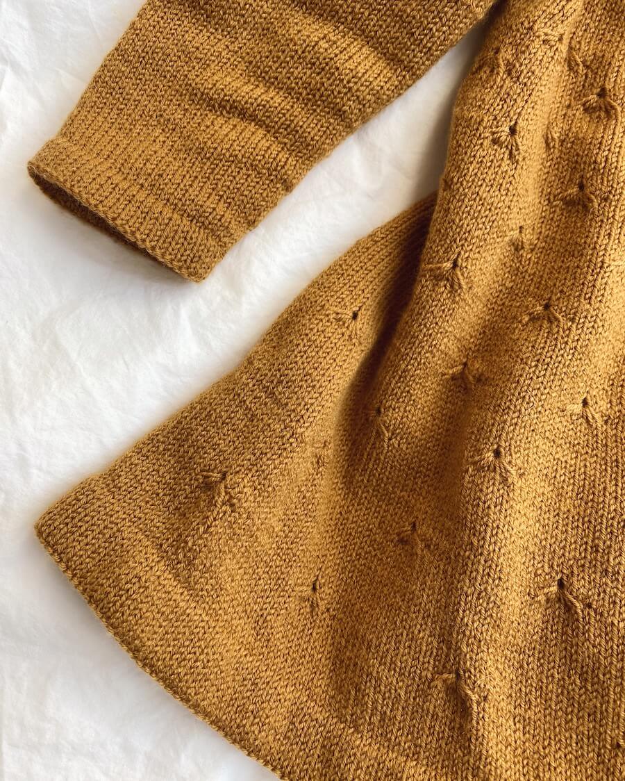 Løvetannkjole strikkes ovenfra og ned. Bærestykket strikkes først frem og tilbake på rundpinnen, slik at det dannes en splitt i nakken. Deretter strikkes resten av bærestykket rundt på rundpinnen. Skjørtet strikkes også rundt på rundpinne, og det strikkes et fint løvetannmønster med økninger, slik at skjørtet får vidde. Løvetannmønsteret får gradvis større avstand ned langs kjolen – som løvetannfrø som flyr i vinden. Ermene strikkes på strømpepinner eller med Magic Loop-teknikk. Langs halskanten og i splitten strikkes til slutt en i-cordkant.