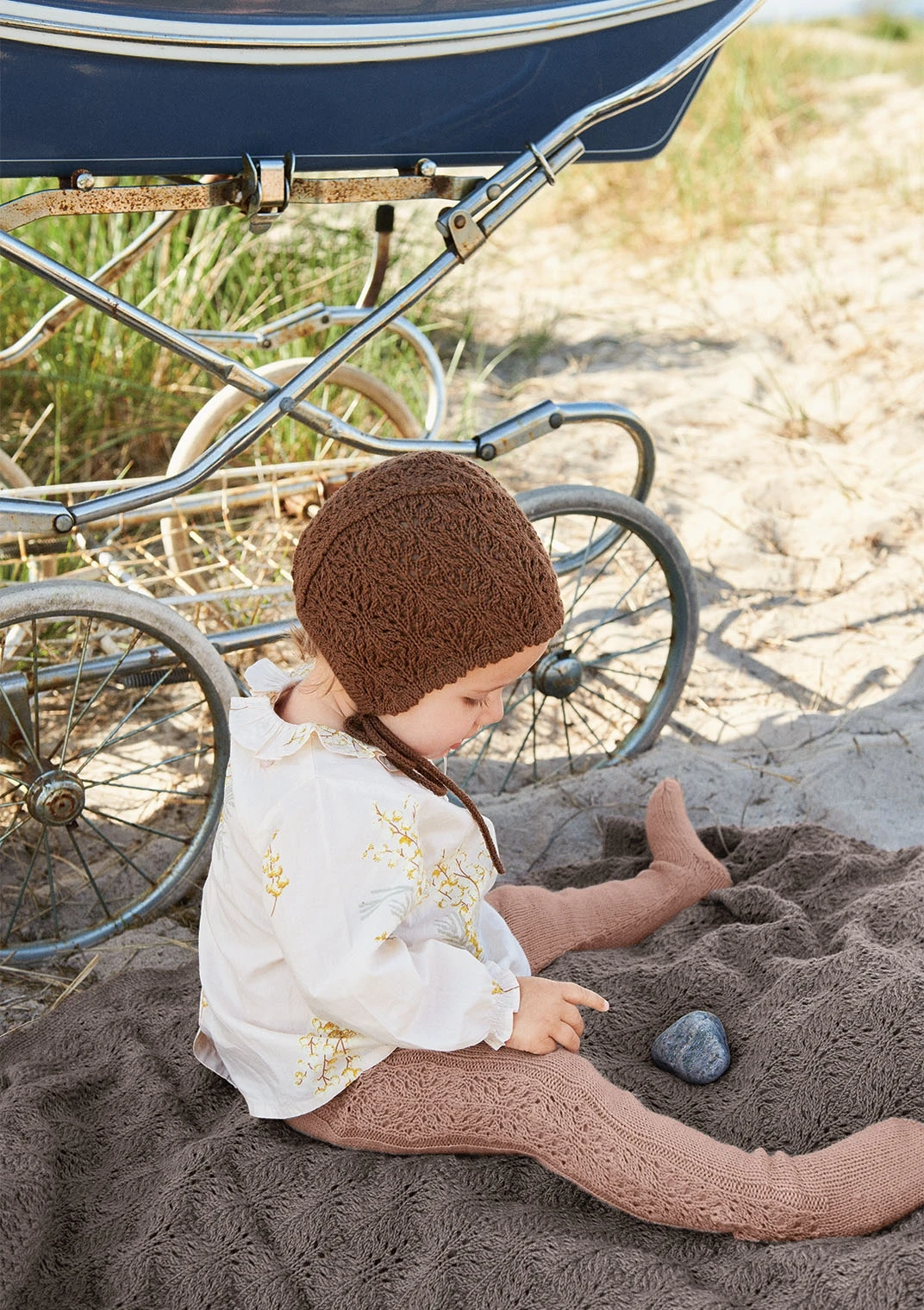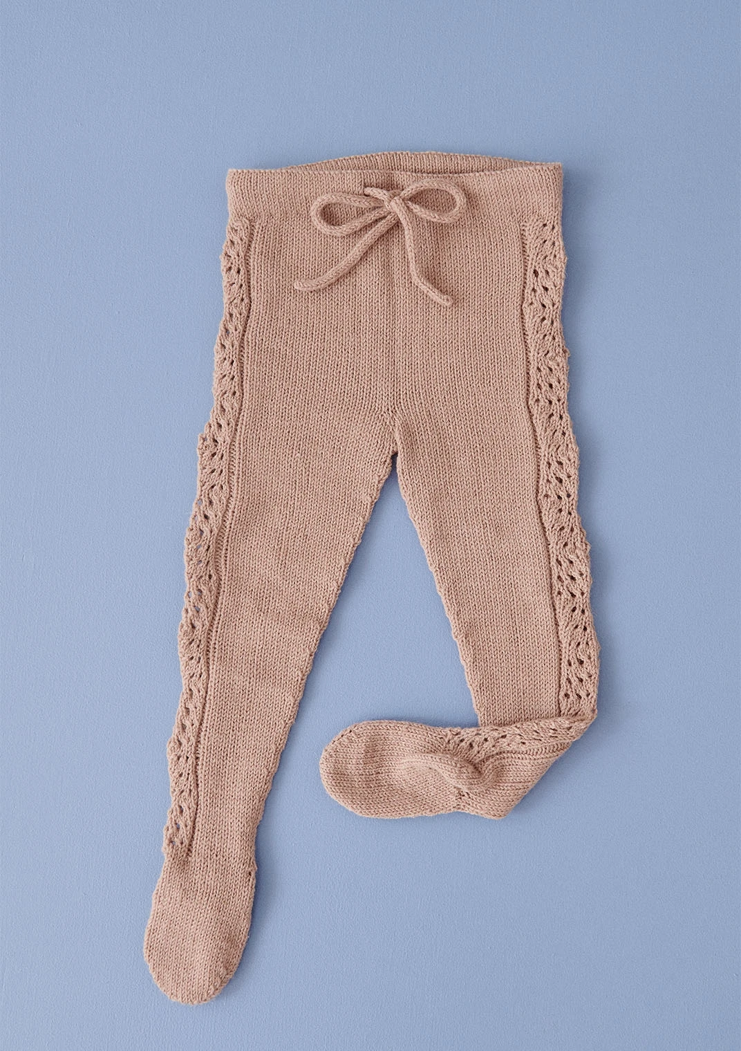 En tettsittende strømpebukse med hullmønster langs sidene. Strømpebuksen strikkes ovenfra og ned i Sunday.