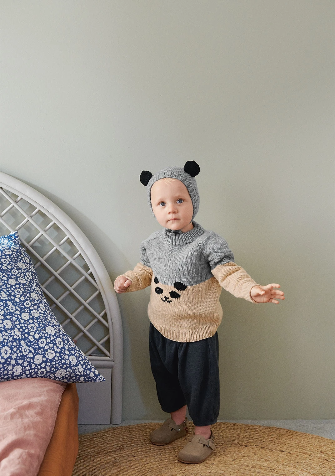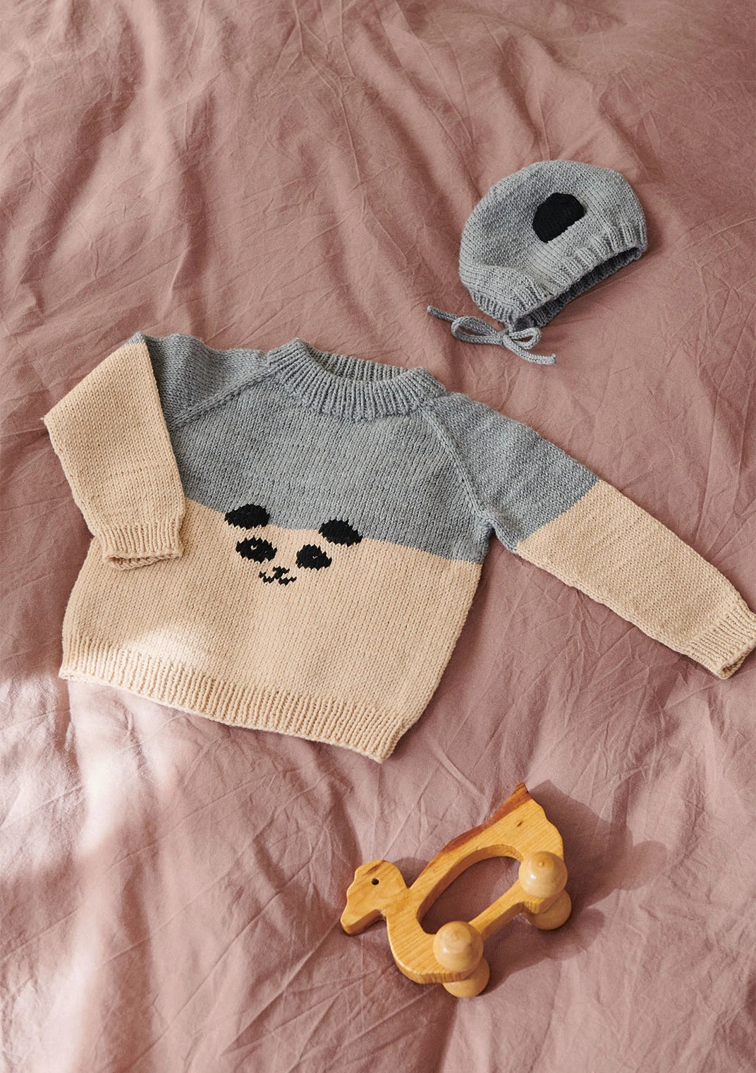 Tilslutt brodéres det en panda med maskesting midt foran, i overgangen mellom gråmelert og sandskjell.