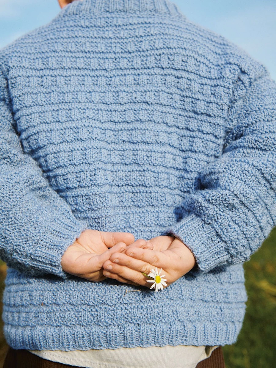 Genseren strikkes rundt med strukturmønster i Sisu