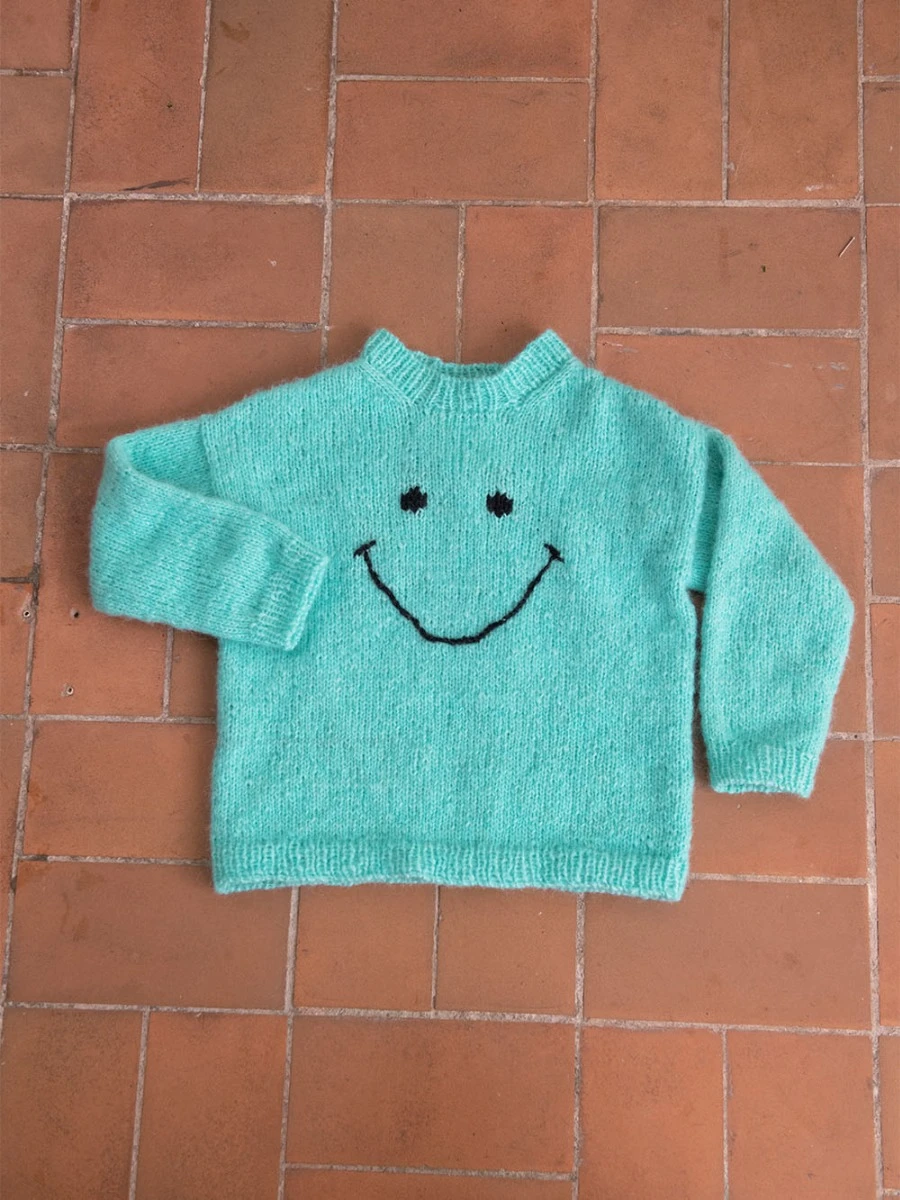 og avsluttes med vrangbord. Halskanten strikkes i vrangbord. Big Smiley broderes på forstykket til slutt.