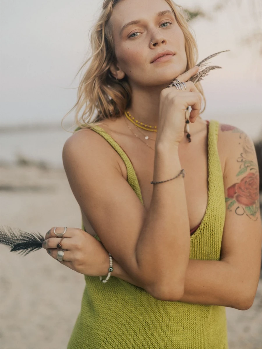 Kjolen har en lett A-fasong. Den strikkes nedenfra og opp med en smal ribbkant nederst og videre glattstrikk. Arbeidet deles under ermene og forstykket og bakstykket strikkes videre frem og tilbake for seg, før det deles til v-hals. En smal ribbkant strikkes rundt ermehullene til slutt.