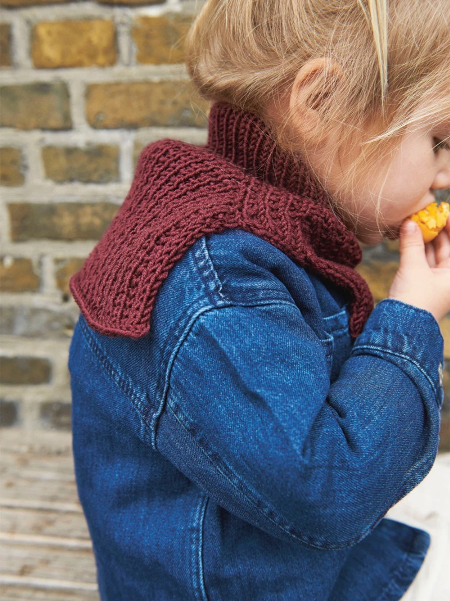 Halsen strikkes ovenfra og ned i perleribb i Merinoull.