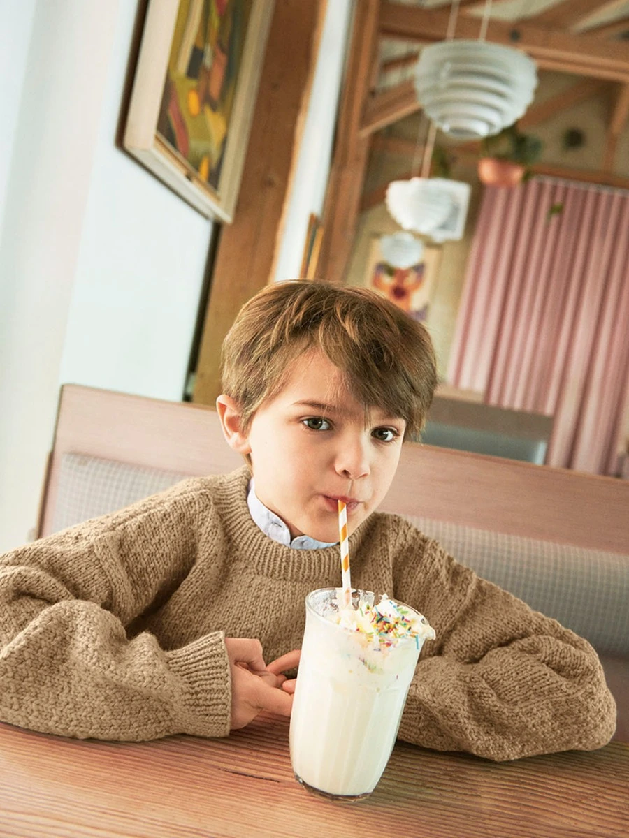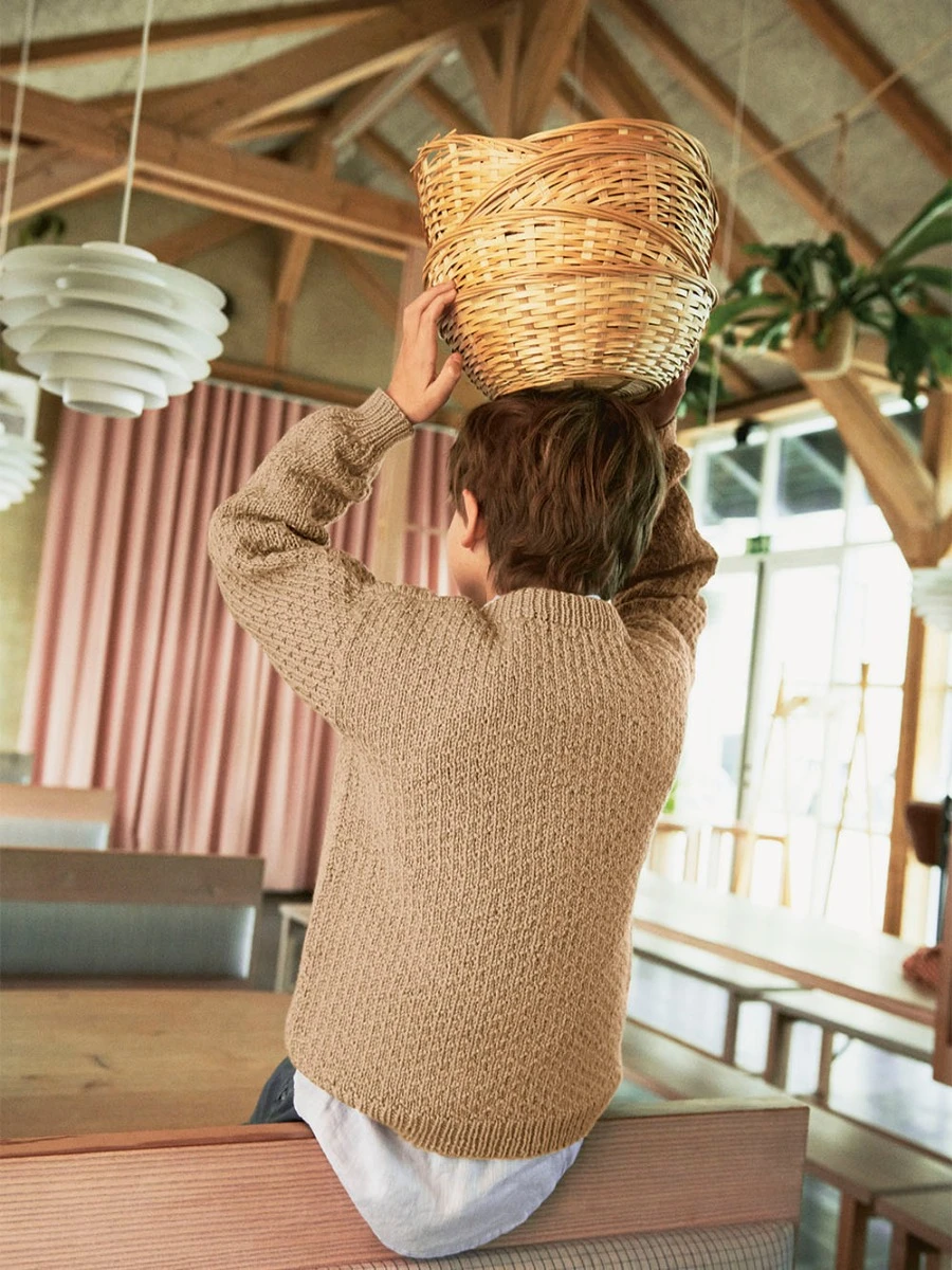 Genseren strikkes nedenfra og opp med mønster etter diagram . Vist her i Merinoull Jeansblå 6052 eller Smart Camel 2542