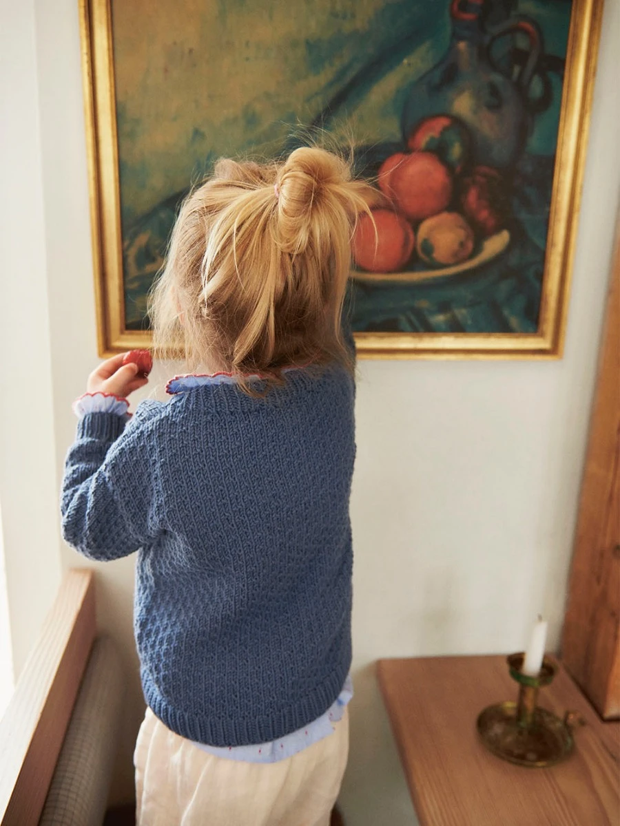 hver side strikkes ferdig hver for seg. Ermene strikkes rundt, ovenfra og ned. Halskanten strikkes til slutt og brettes dobbel mot vrangsiden.