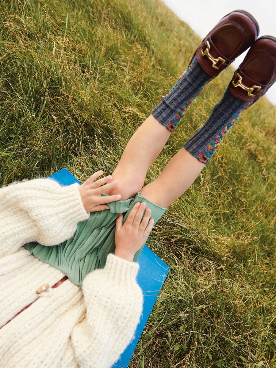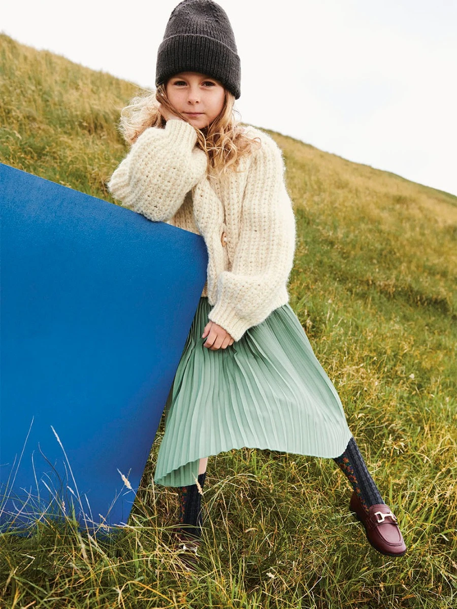 rundt i halvpatent før det avsluttes med en vrangbord. Videre strikkes det i-cord til forkanter og hemper til knapphull. Til slutt sys det i knapper. Hele jakken