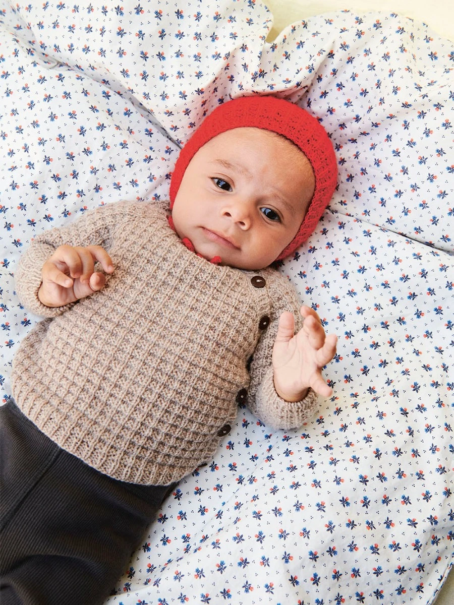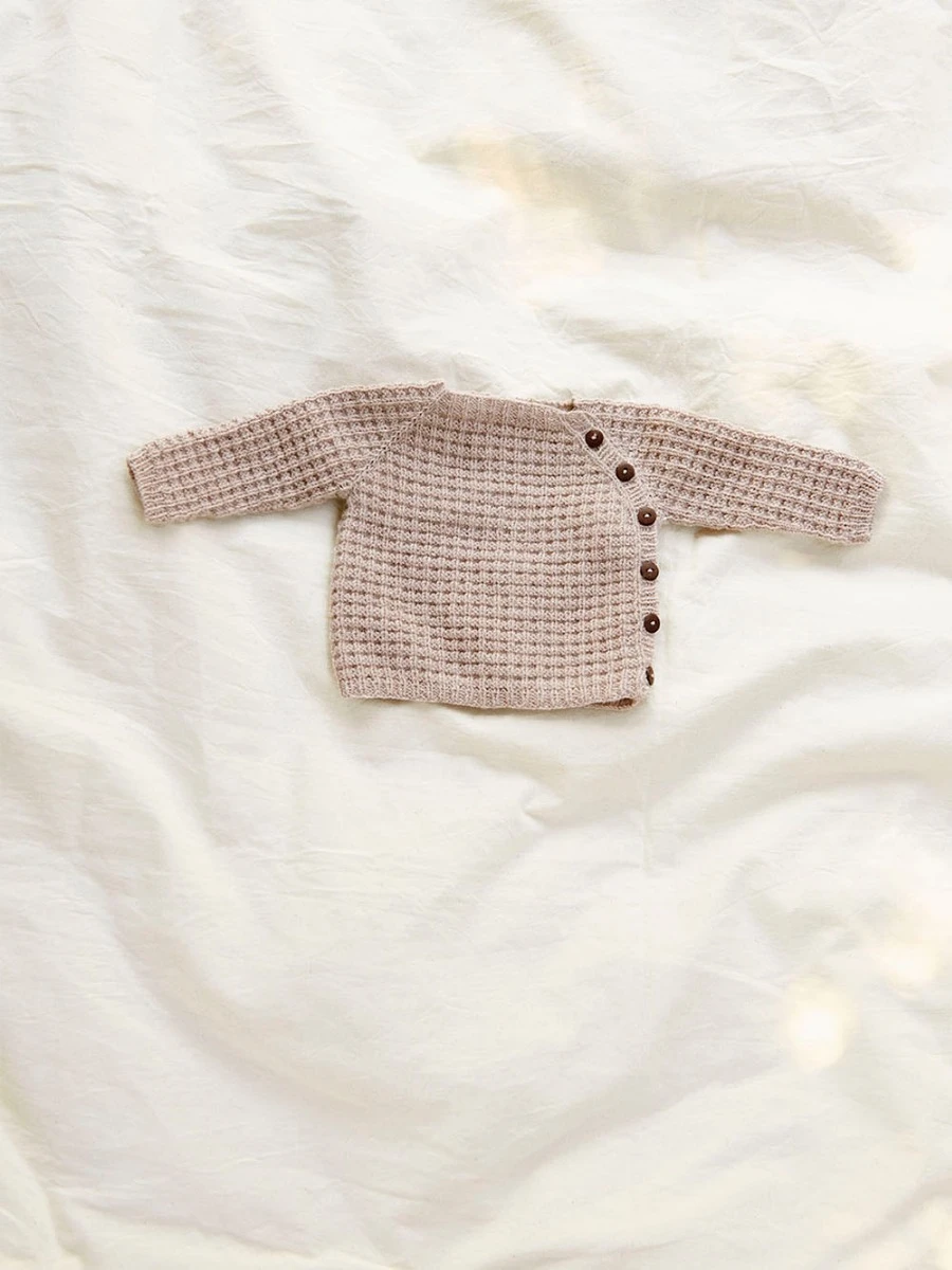 Jakken strikkes ovenfra og ned etter diagram som danner en slags vaffelstruktur, med økninger til raglan og knepping på siden av forstykket i Sunday.
