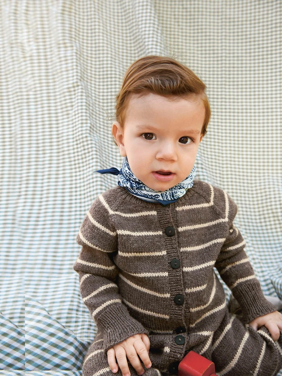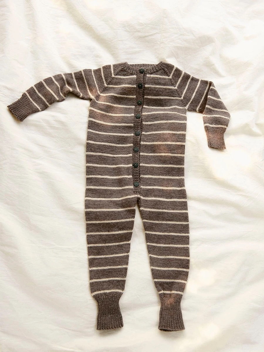 Stripemønsteret strikkes på hver 11. og 12. pinne/ omgang, og fortsetter på hele dressen. Til slutt strikkes det opp masker til forkanter.