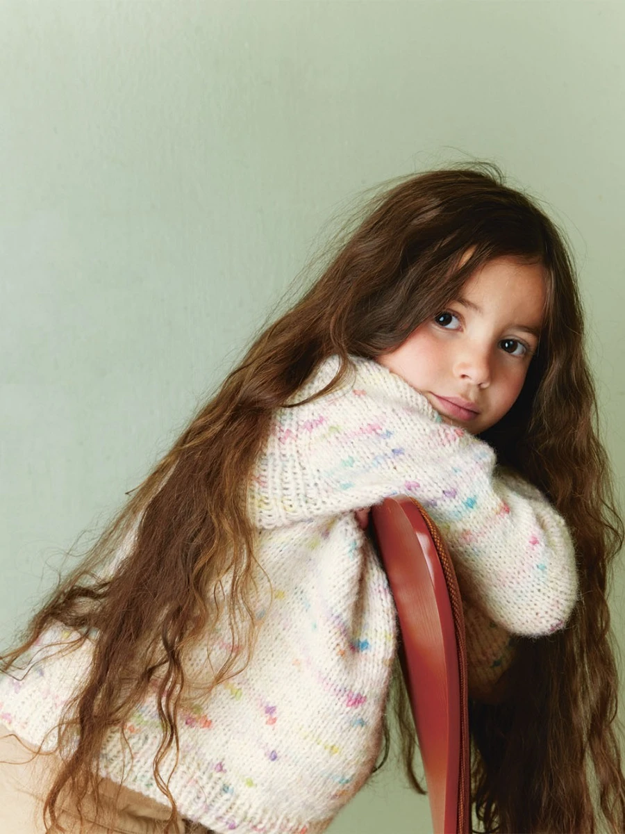 Genseren har en vid passform, og strikkes ovenfra og ned med raglansøkninger i Poppy.