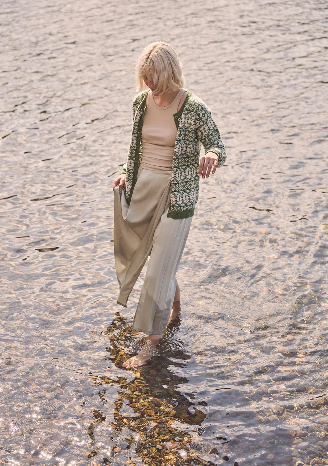 Kofte med mønsterstrikk, strikket nedenfra og opp i Sisu.