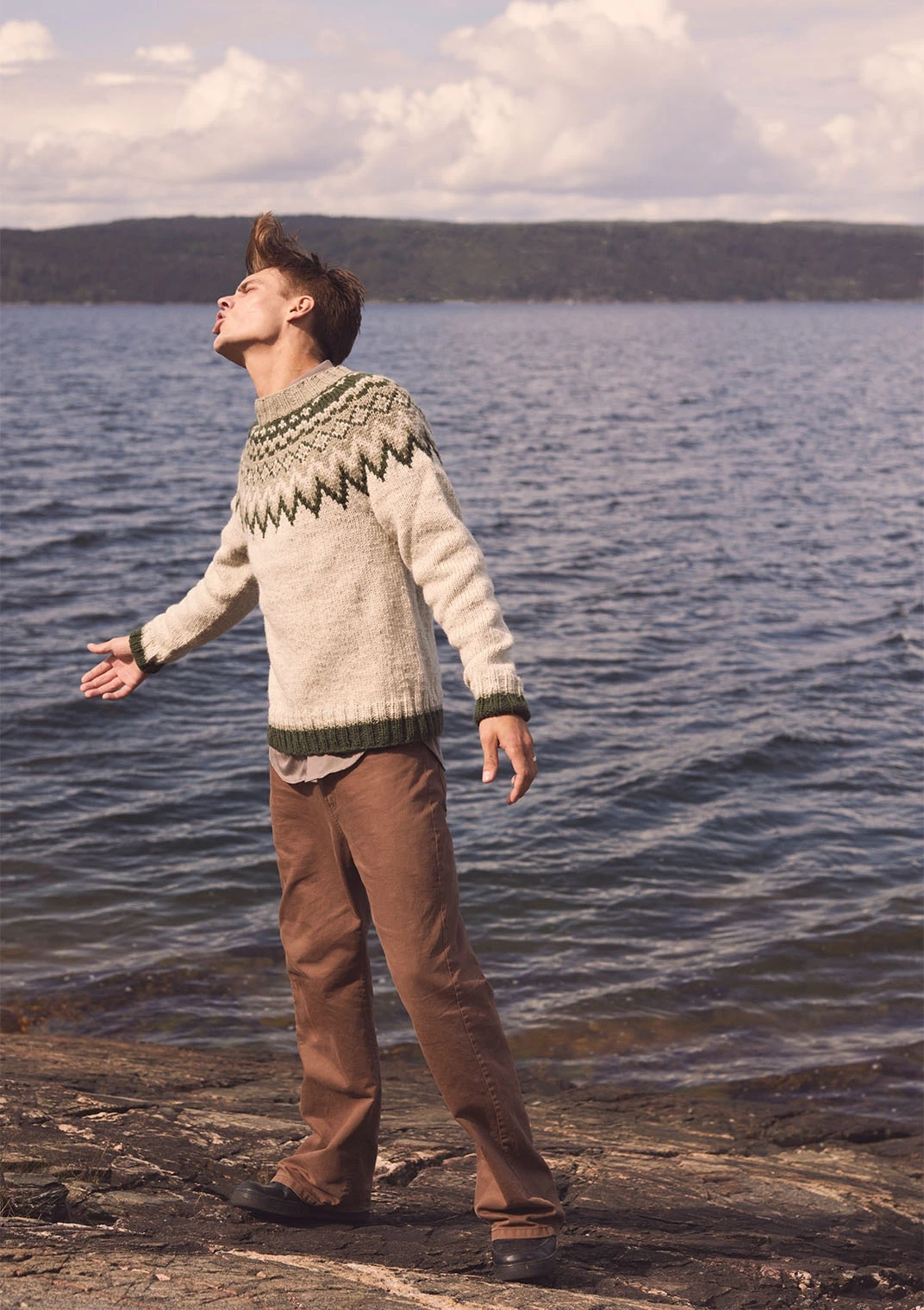 Genser med mønsterstrikk, strikket ovenfra og ned i Fritidsgarn.