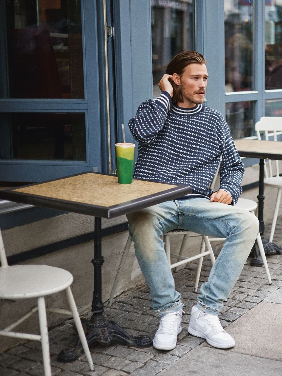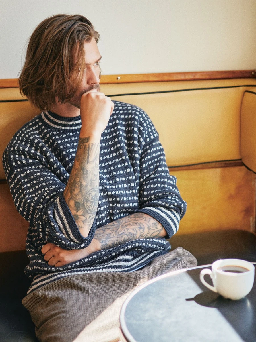 opp nye masker til ermehull før forstykket strikkes sammen med bakstykket. For- og bakstykket strikkes videre rundt før det avsluttes med en vrangbord. Det strikkes opp masker rundt hvert ermehull til ermer. Ermene strikkes rundt før det avsluttes med en vrangbord. Halsen strikkes til slutt i vrangbord.