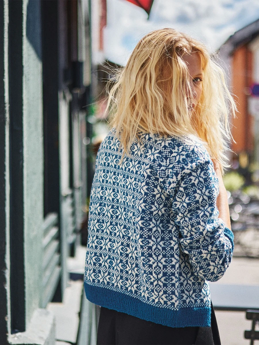 forstykket. Herfra strikkes bolen frem og tilbake og det felles til halsutringning. Ermene strikkes for seg med mønster etter diagram. Det klippes opp midt foran og i ermesidene til ermehull. Forkanter, belegg og halskant strikkes til slutt.
