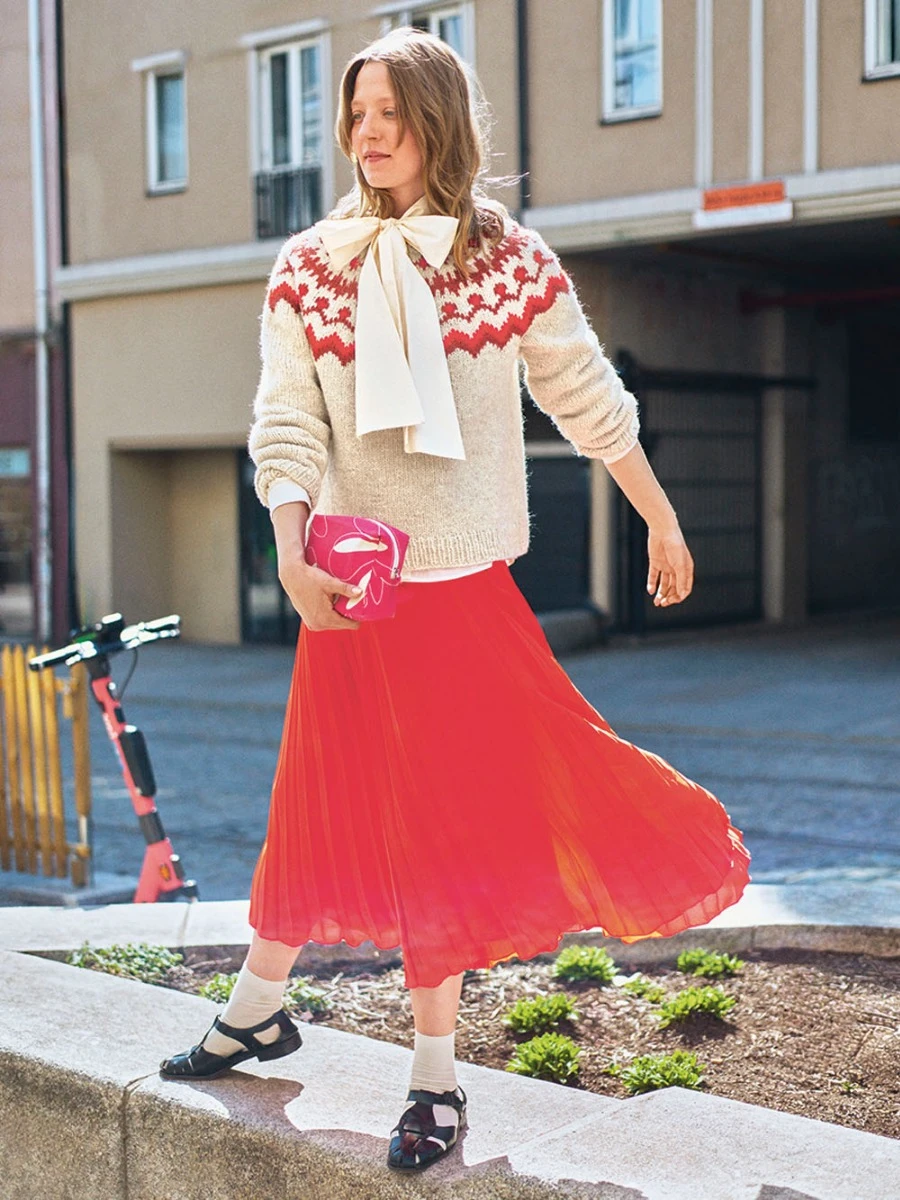 Halskanten strikkes først. For å forme en dypere halsutringning foran, strikkes det vendepinner med GSR. Det strikkes mønster etter diagram med økning til rundt bærestykke. Arbeidet deles til ermer, for- og bakstykket som strikkes ferdig hver for seg.