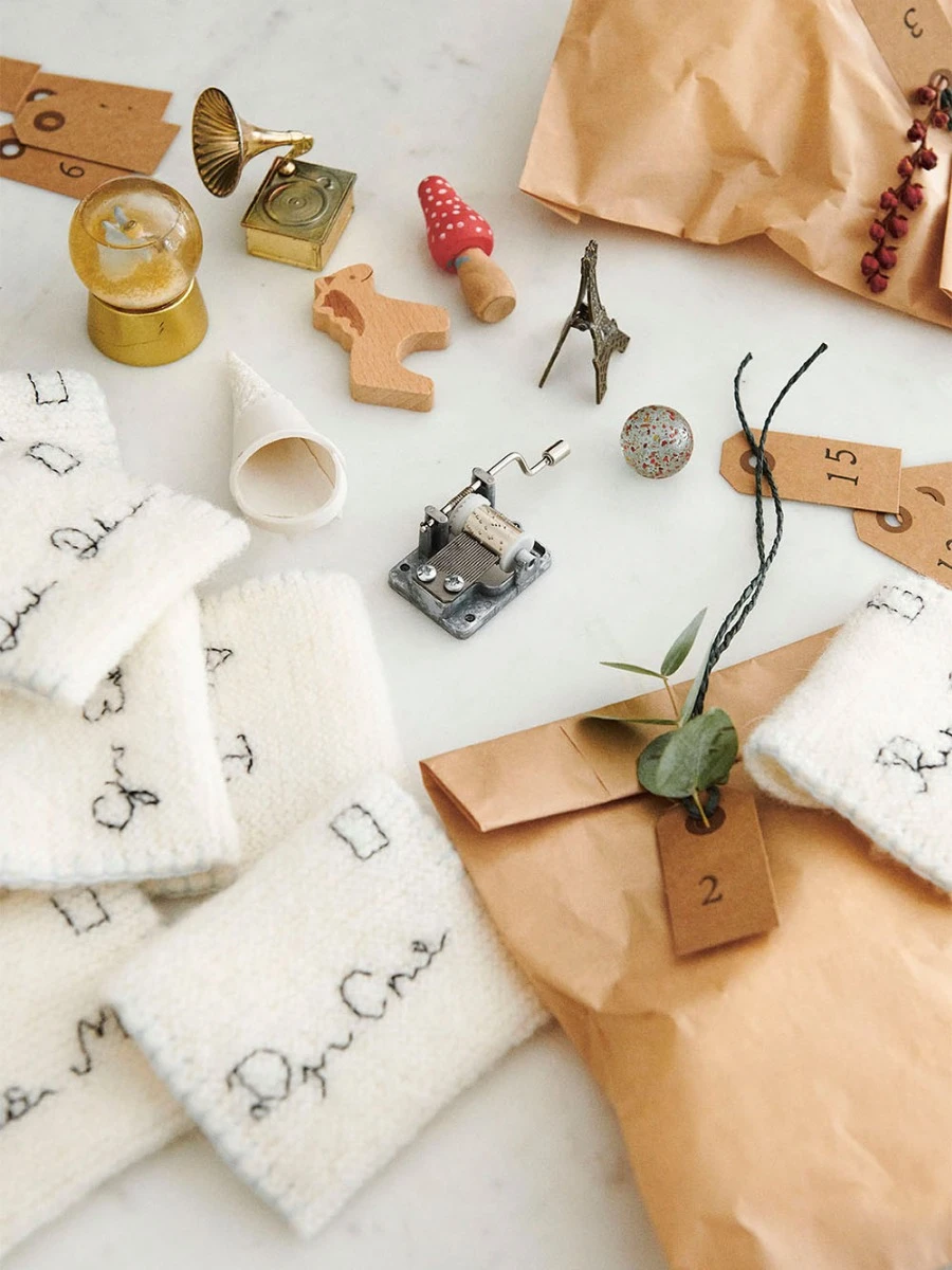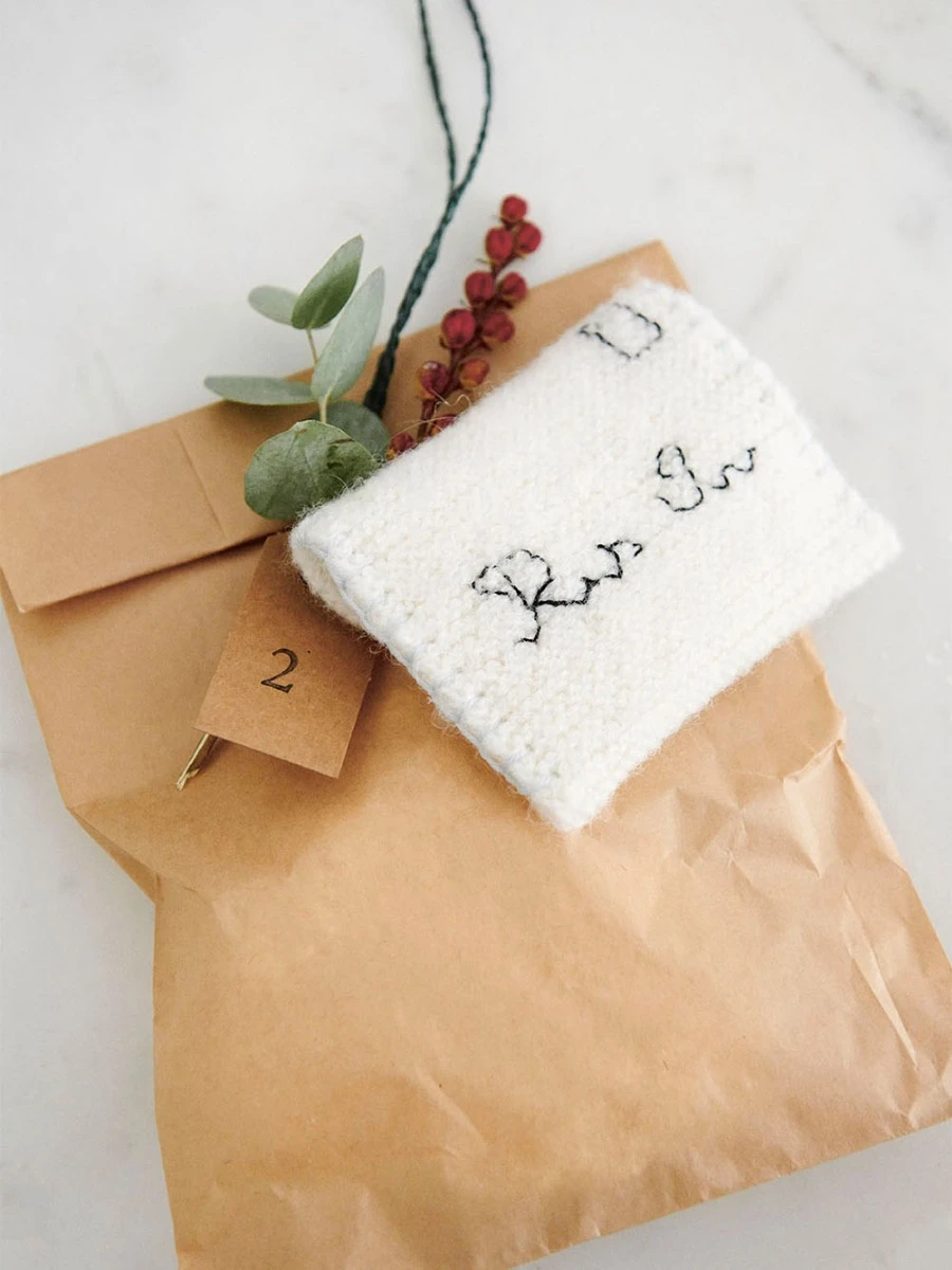 Konvolutten strikkes frem og tilbake i rillestrikk i Tynn Peer Gynt, brodert med Sunday.