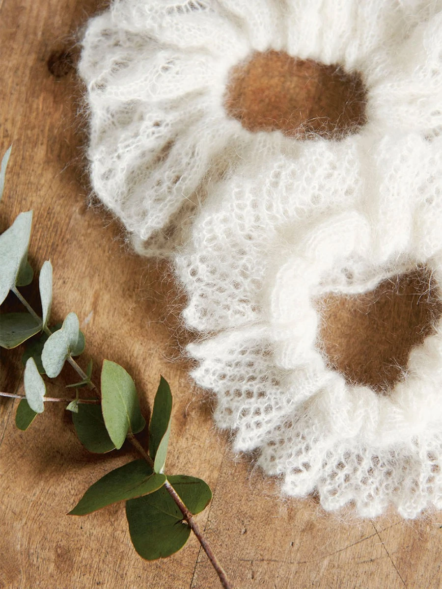 Scrunchie strikkes frem og tilbake til hel lengde, med løpegang i den ene siden og hullmønster i den andre siden i Tynn Silk Mohair