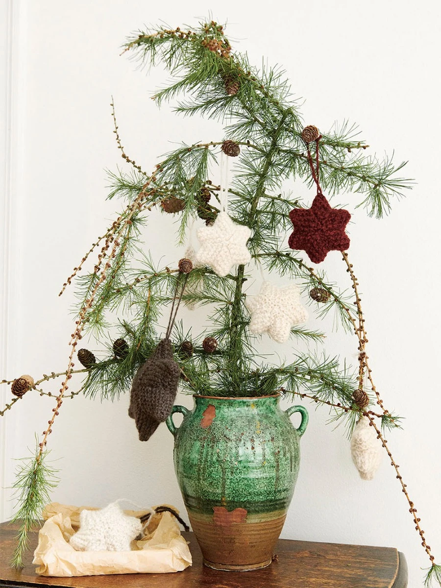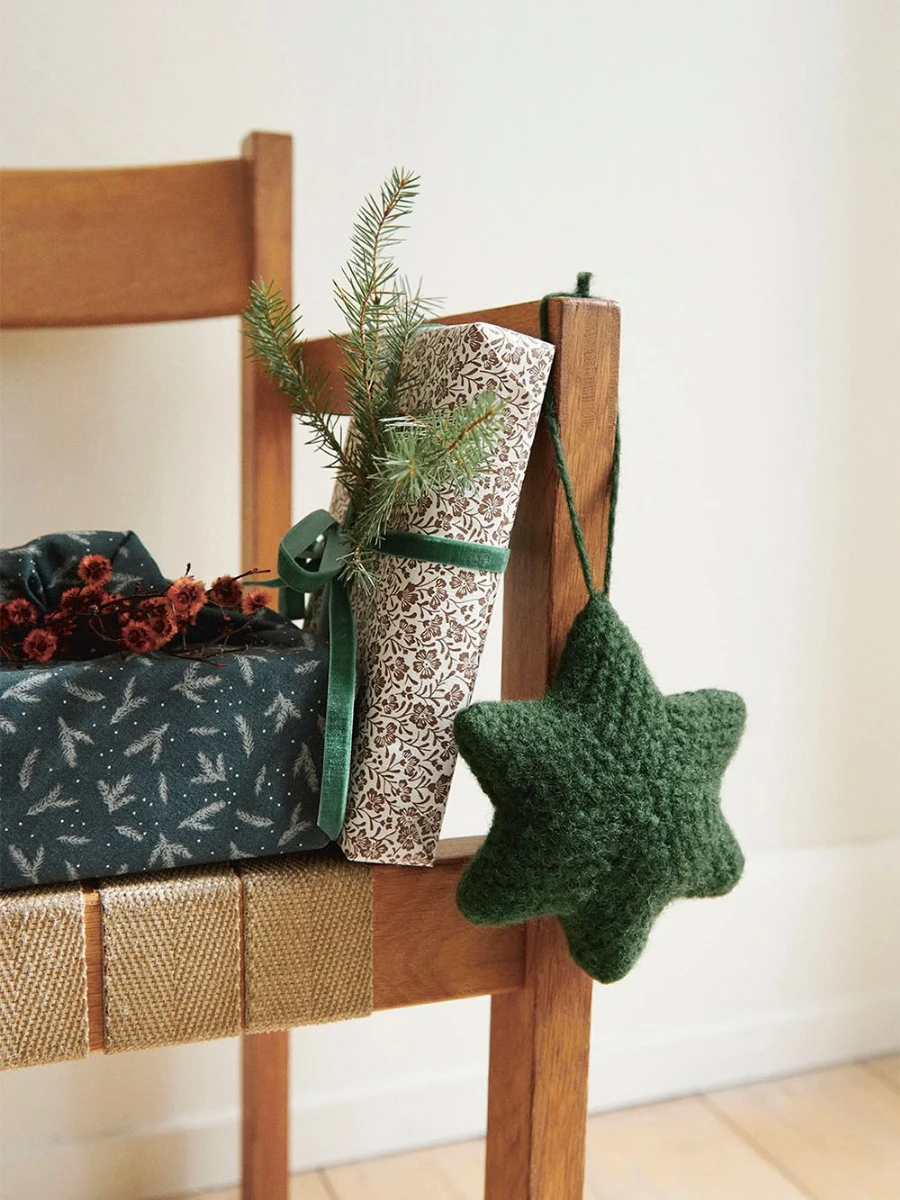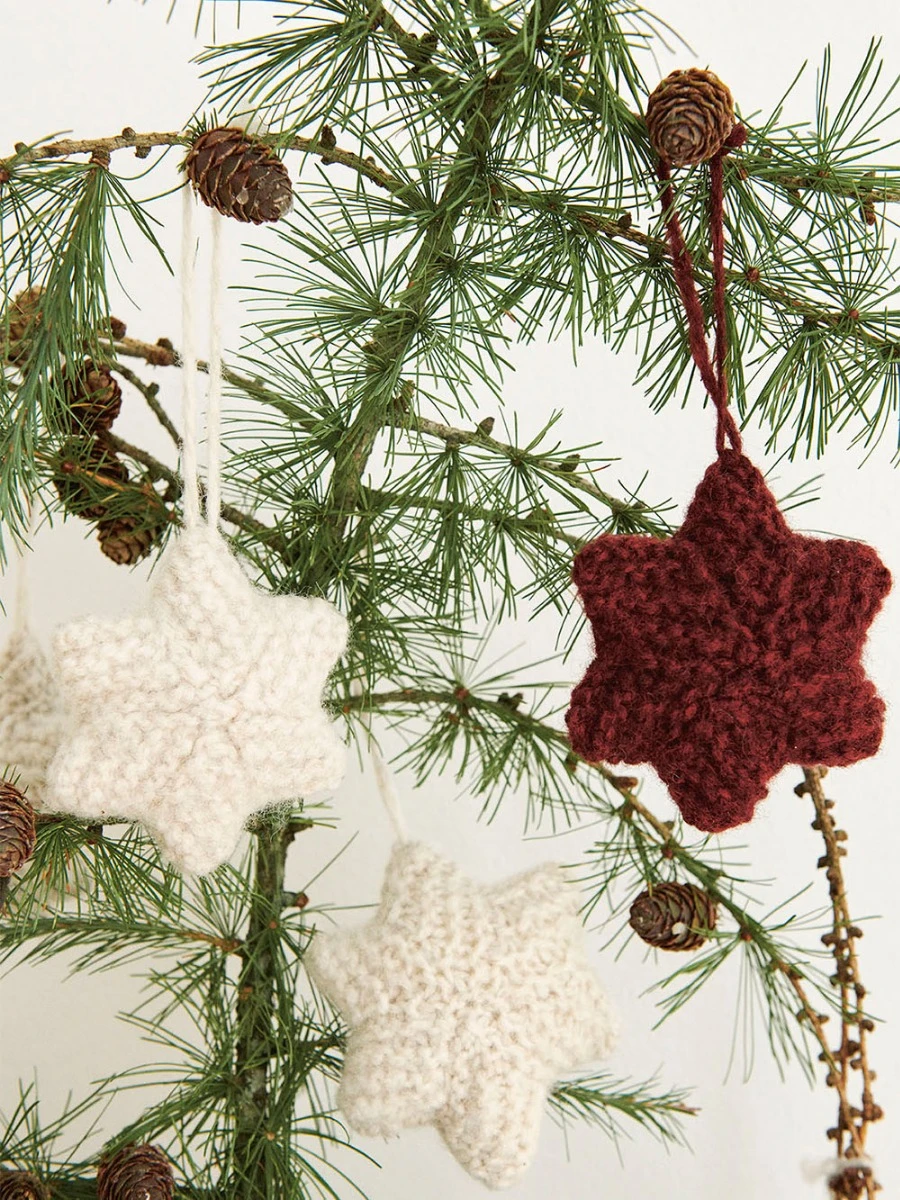 Det økes og felles på hver pinne fra rettsiden for å danne en spiss. Deretter felles alle maskene utenom 1, og det strikkes opp nye masker langs siden av arbeidet. Dette gjentas til man har en hel stjerne. Stjerna toves i maskinen før det broderes på den, og den fylles med garn eller fyllvatt.