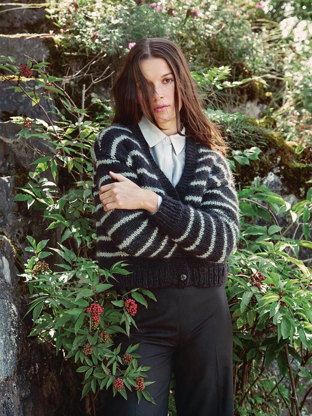 Embla stripejakke er en moderne og feminin cardigan med klassiske striper, v-hals og skrå skuldre. Jakken strikkes nedenfra og opp med strukturert passform og gjennomtenkte detaljer. Den strikkes med 2 tråder Sunday og 2 tråder Tynn Silk Mohair, noe som gir et lett, luftig og eksklusivt uttrykk. En tidløs jakke som passer like godt til hverdags som til jobb og fine anledninger.