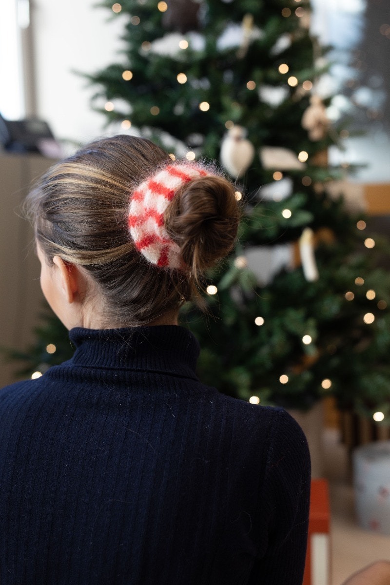 Et nydelig scrunchie du kan strikke i akkurat det garnet du ønsker! Vi har valgt Ballerina Chunky Mohair for en myk og luftig følelse, med striper inspirert av klassiske peppermyntestenger. Perfekt som en liten strikkeutfordring eller en personlig gave!