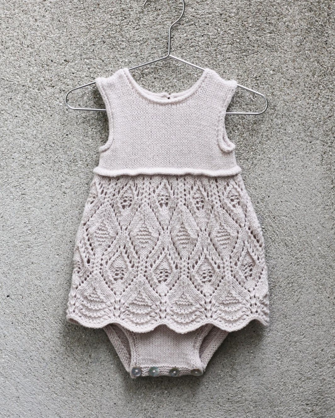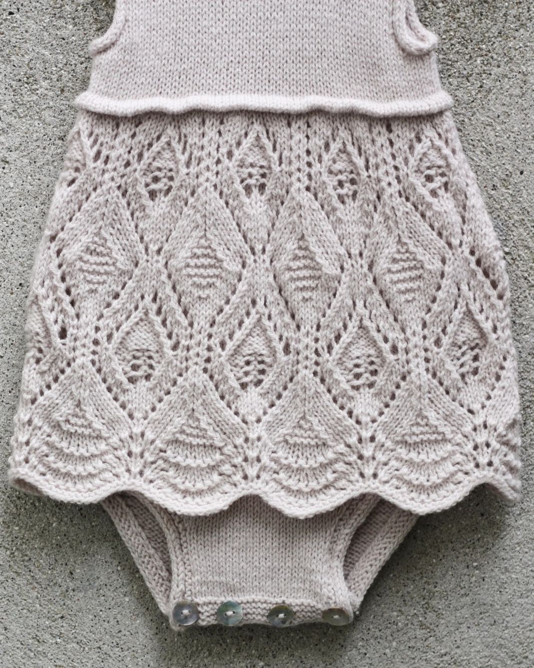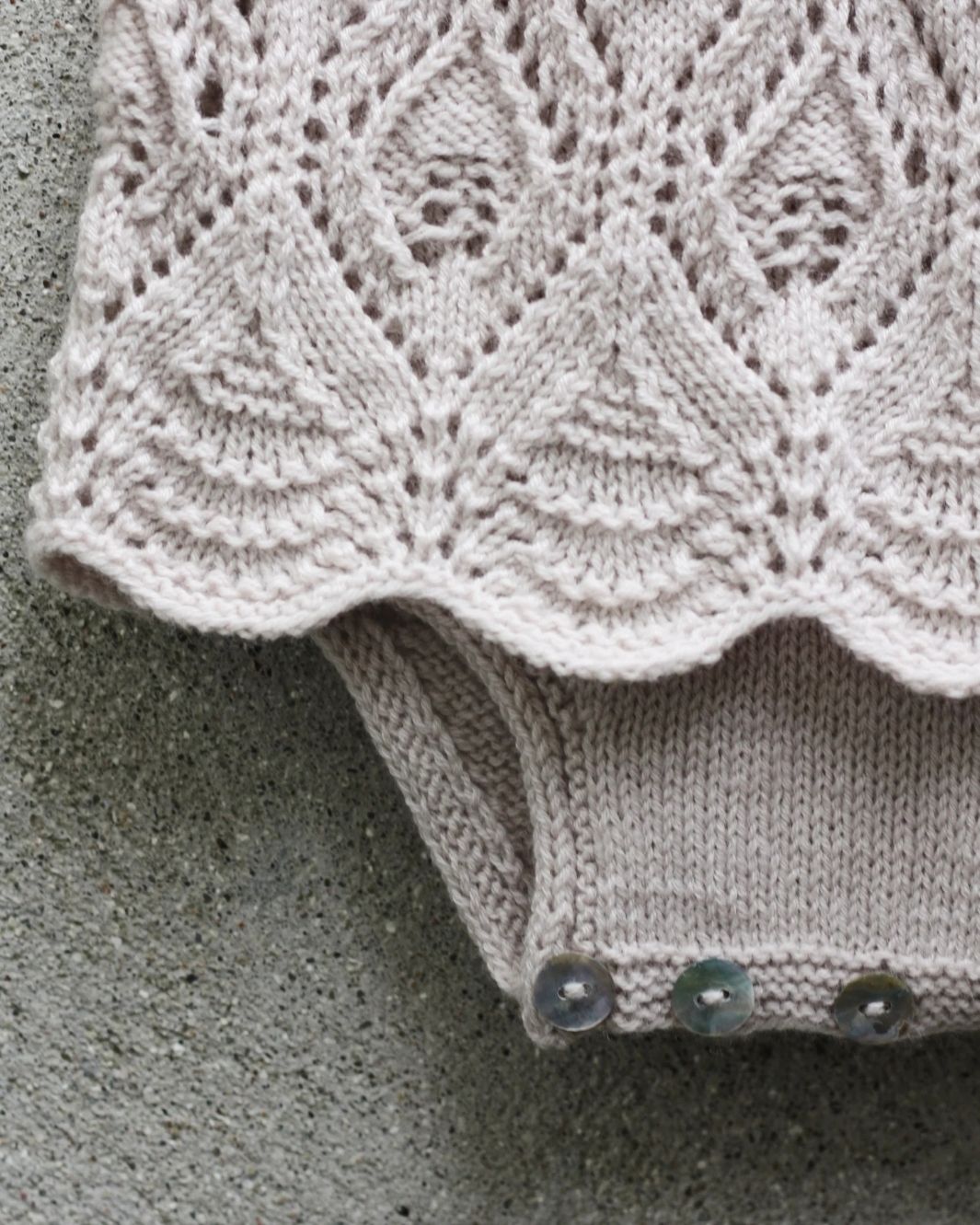 Blondekjolebodyen har knapper mellom benene og det strikkes en splitt i nakken, det lukkes med en knapp.