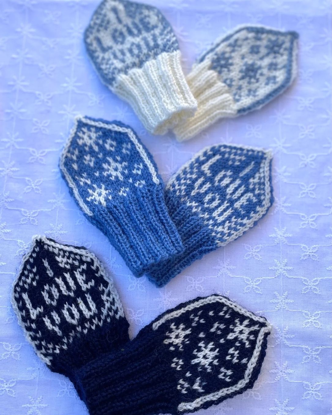 Bak alle strikkemønster til Mønsteridyll ligger det mye arbeid og omtanke bak og hvert design har sin egen historie. Serien I Love You Snøkrystallvotter er laget med tanke på å minne de man ikke har iblant oss lenger. Når jeg ser snøkrystaller som faller fra himmelen tenker jeg at dette er små kyss fra mennesker som har gått bort. Noen mennesker vil man alltid bære med seg i hjertet.