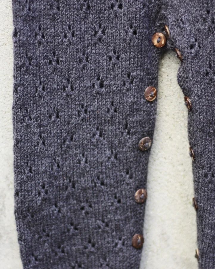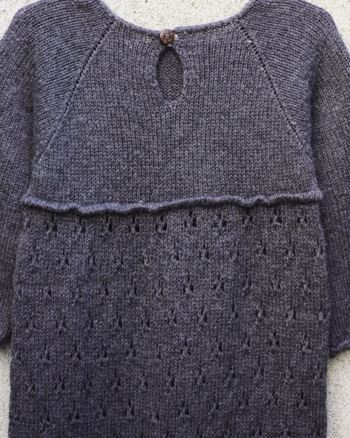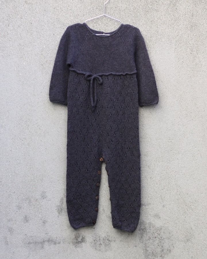 Benene strikkes i et kløvermønster etter diagram. Like under brystet strikkes en bise, som samles i en sløyfe på forstykket. Når kroppen er strikket, strikkes ermene nedenfra og opp, og til slutt settes alle delene sammen, og det strikkes bærestykke med raglanfellinger og med en splitt i nakken.