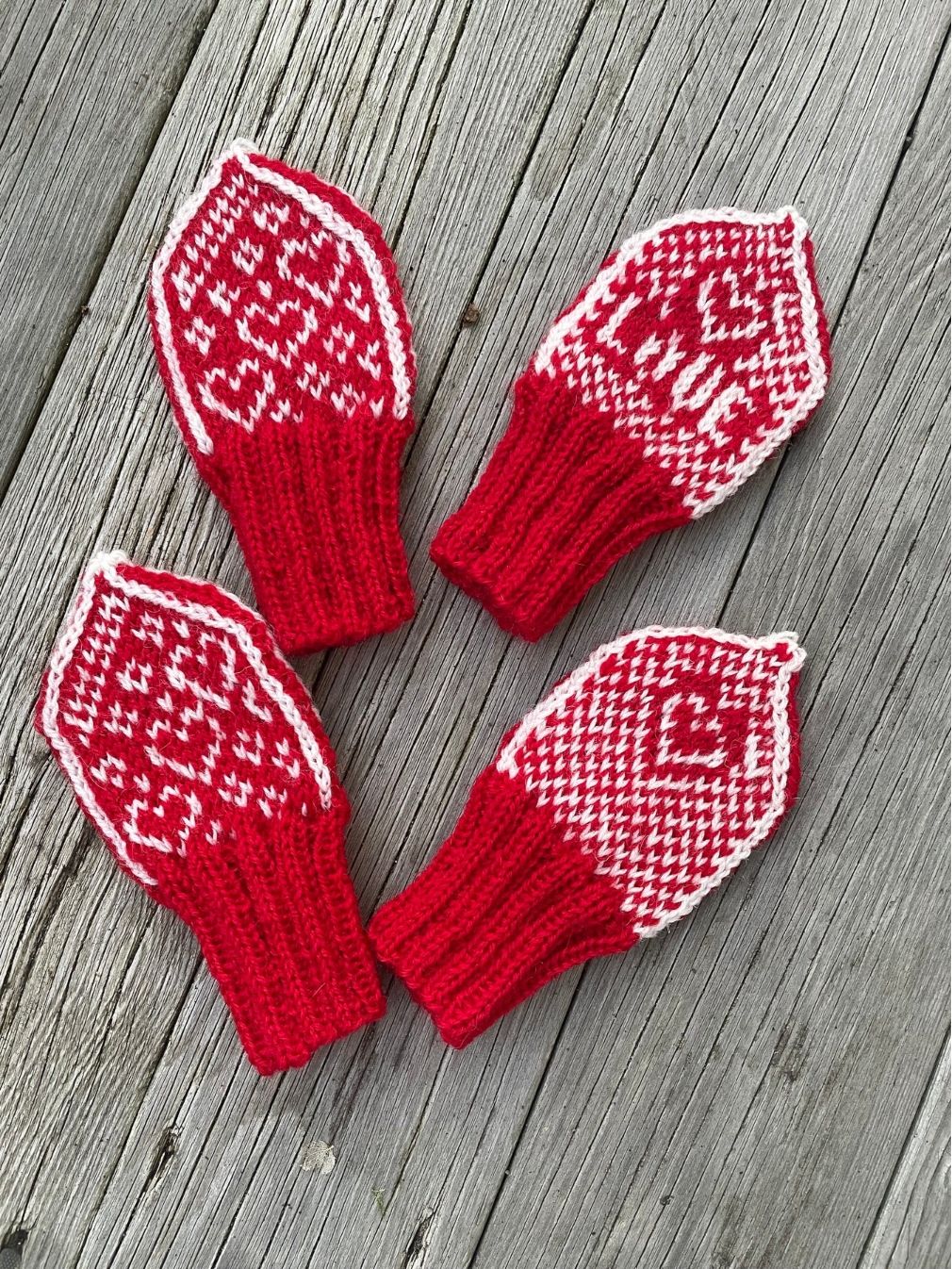 Materialer: Tynn Per Gynt garn fra Sandnes Garn Rød 50g 4219 og Hvit 50g 1002