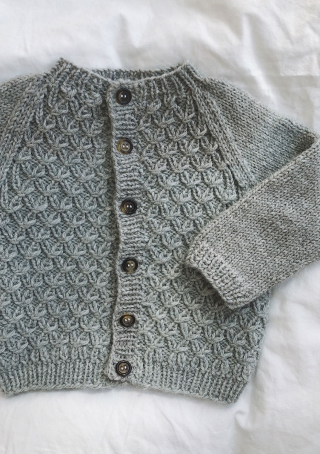 Carls Cardigan strikkes nedenfra og opp med raglanfellinger på bærestykket. Bol og for- og bakstykket strikkes i smockstrikk, ermene strikkes i glattstrikk.
