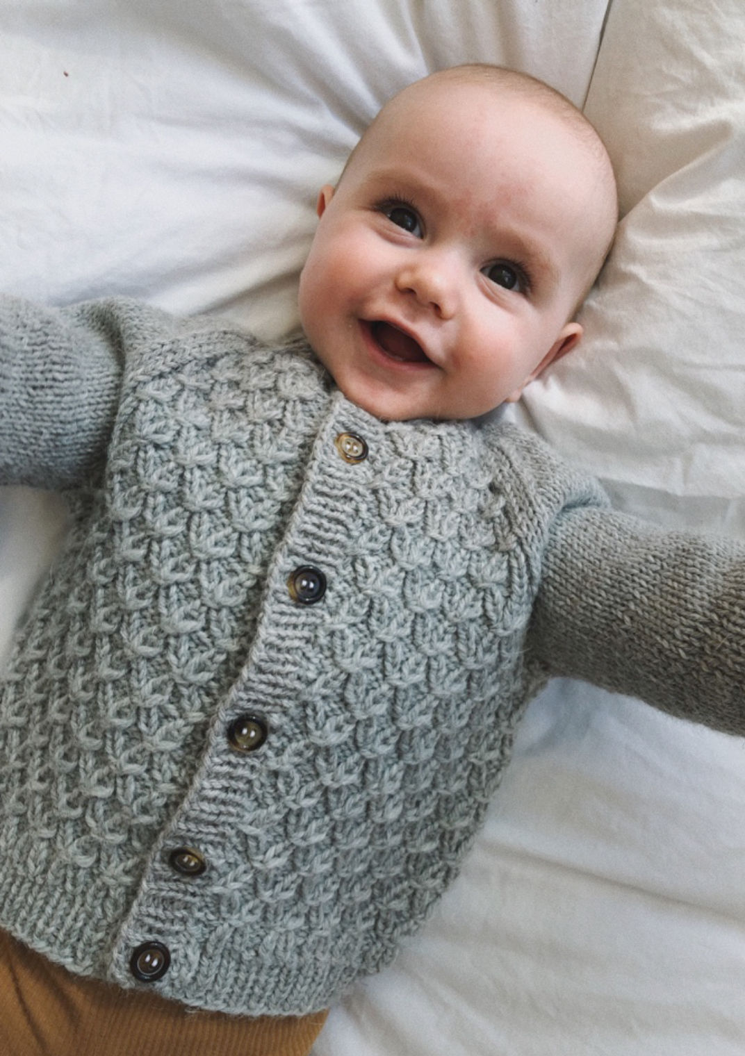 Carls Cardigan strikkes nedenfra og opp med raglanfellinger på bærestykket. Bol og for- og bakstykket strikkes i smockstrikk, ermene strikkes i glattstrikk. Smockstrikk utvider seg i vask og bruk – derfor vil cardiganen se smal ut når den nettopp er strikket. Etter vask og i bruk vil den få de rette mål. Strikk en prøvelapp for å sjekke strikkefastheten etter vask før du går i gang.