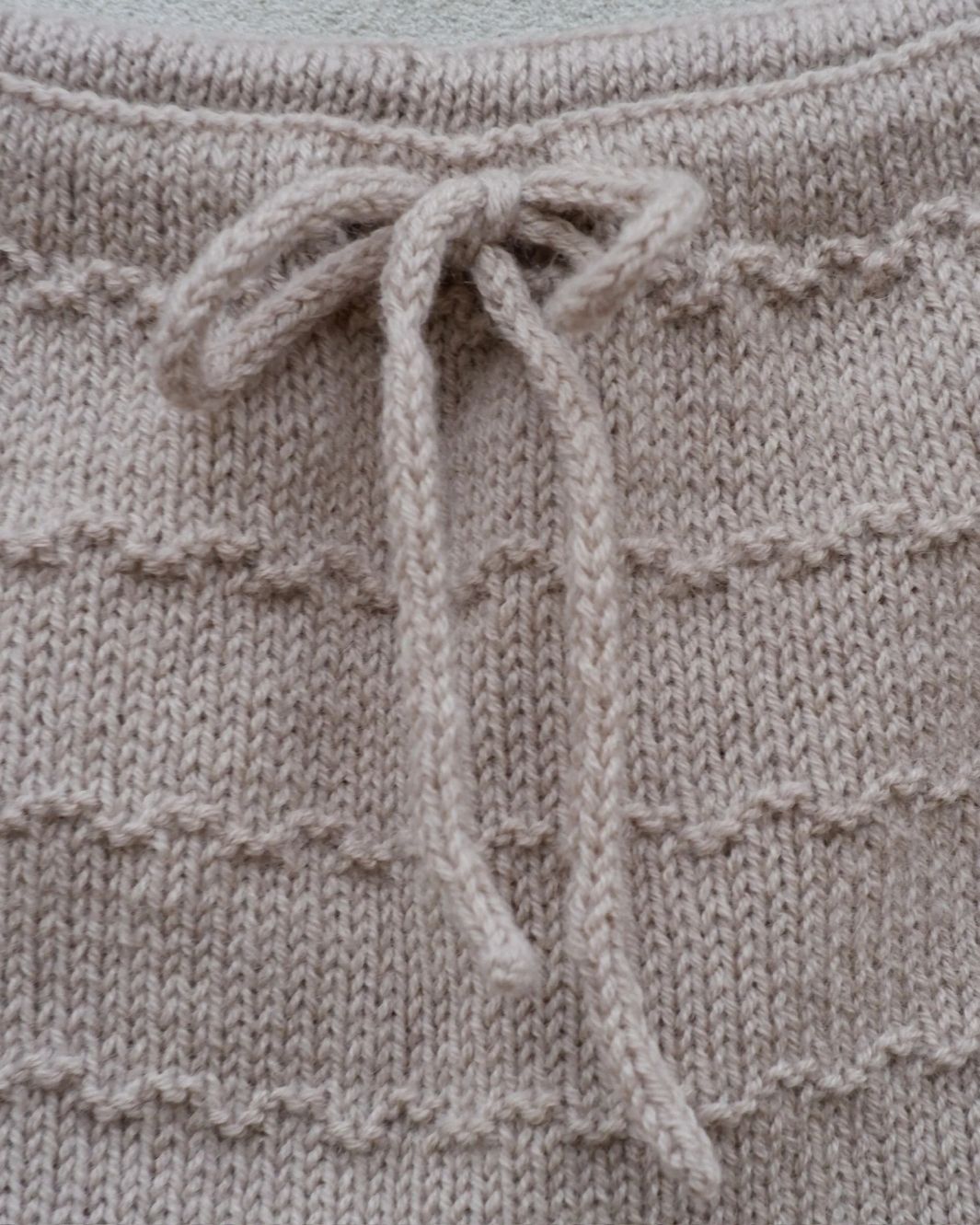 Først strikkes benene hver for seg, deretter samles de, og det strikkes rundt opp til linning med vendepinner på baksiden for å gi plass til bleie. I linningen strikkes to hull til bindebånd, og til slutt strikkes en i-cordsnor, som føres gjennom linningen, som bindebånd.