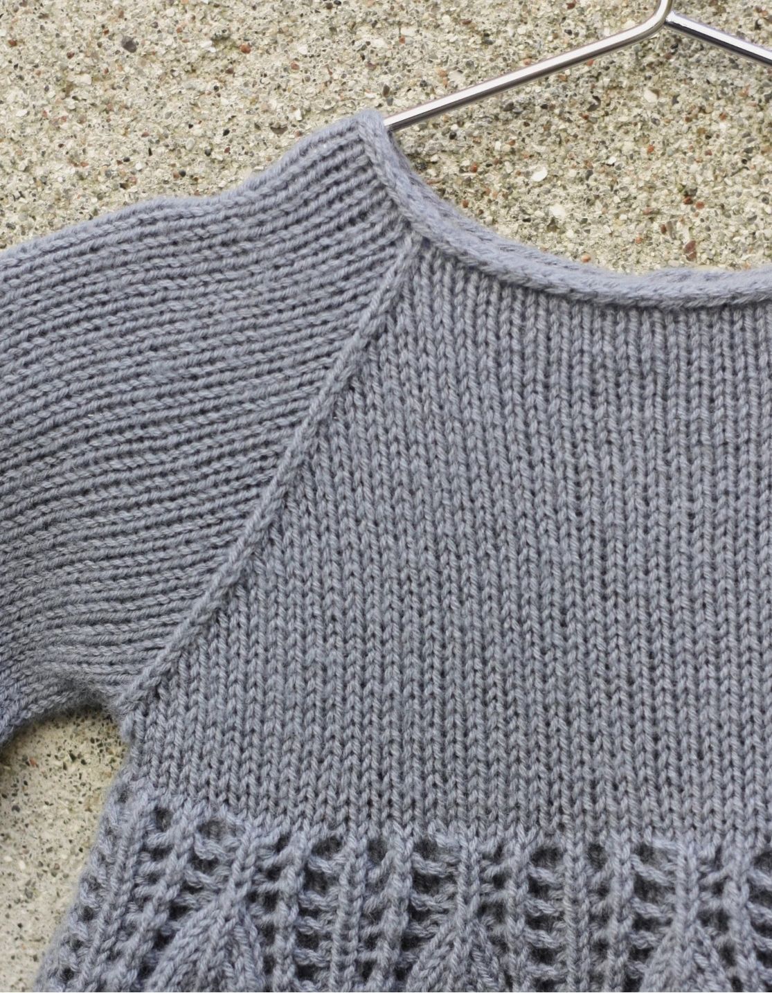 Ermene strikkes rundt på strømpepinner, og de strikkes sammen med kroppen ved hjelp av raglan.