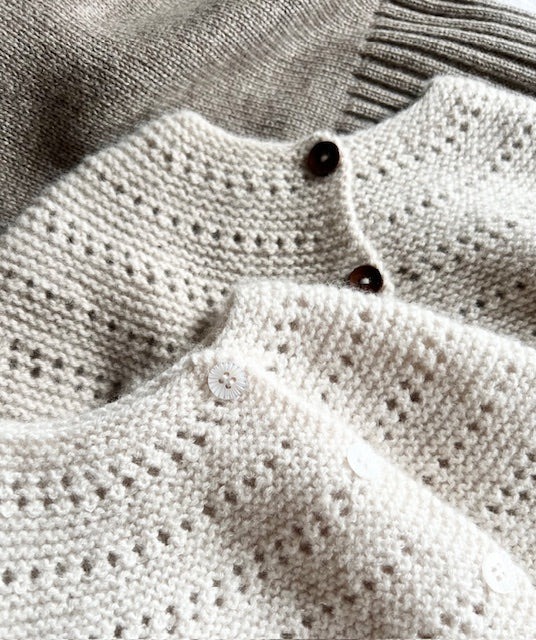 Vibes jakke Mini med knappestolpe på siden strikkes ovenfra og ned i rillestrikk med hullmønster. Bærestykket og kroppen strikkes frem og tilbake på en lang rundpinne. Ermene strikkes rundt på settpinner eller med magic loop teknikk.