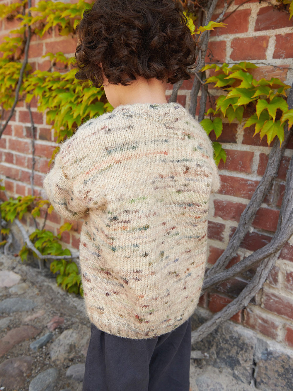 Det legges først opp masker til bakstykket, som strikkes frem og tilbake med vendepinner for å lage en dypere utringning i nakken. Bakstykket strikkes ned til under ermene. Videre strikkes det opp masker langs hver skulder til høyre og venstre forstykke, som strikkes hver for seg med vendepinner og økninger til halsutringning. Forstykkene strikkes sammen og det strikkes frem og tilbake ned til under ermene. For- og bakstykket samles og strikkes videre rundt. Det strikkes opp masker rundt hvert ermehull til ermer, som strikkes rundt i glattstrikk. Til slutt strikkes det opp masker til halskant som strikkes i vrangbord, og brettes dobbel mot vrangsiden.