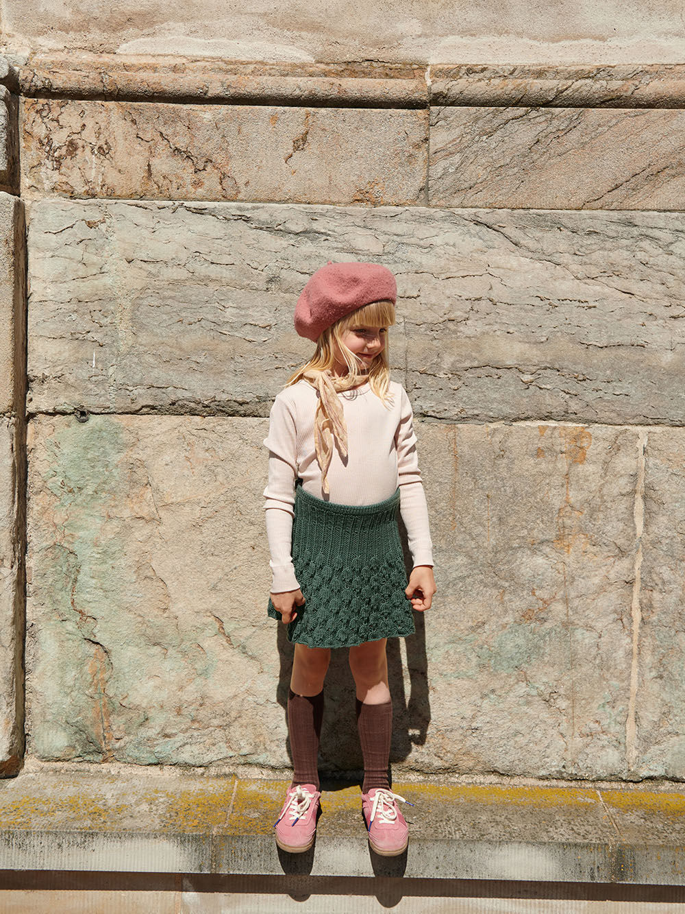 Skjørtet strikkes nedenfra og opp med hullmønster etter diagram i Merinoull.