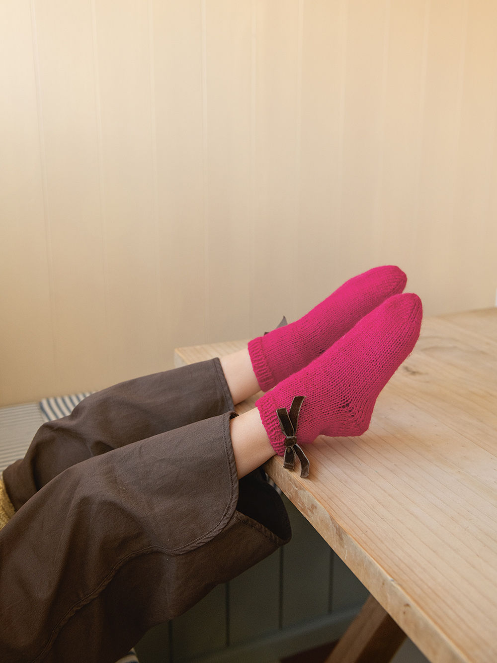 Strømpene strikkes ovenfra og ned i ribbstruktur eller i glattstrikk.
