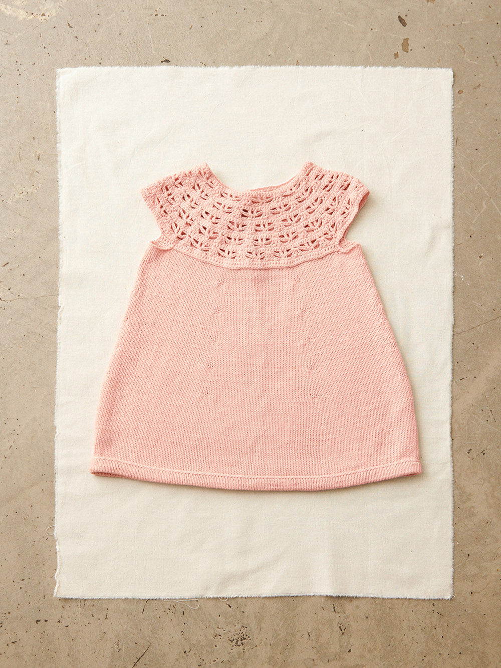 Først hekles bærestykket frem og tilbake med økninger til rundt bærestykke, før arbeidet deles til ermer og skjørt. Videre strikkes det opp masker til skjørtet. Skjørtet strikkes i glattstrikk før det avsluttes med en kant. Kanten strikkes i glattstrikk fra vrangsiden, brettes dobbel mot rettsiden og felles av med heklenål.