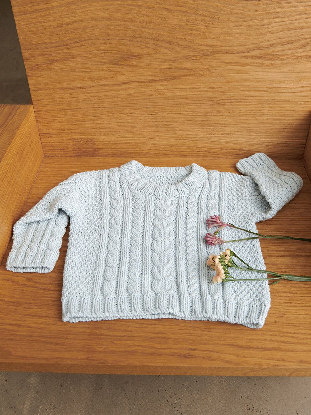 Det strikkes opp masker rundt ermehullene og ermene strikkes rundt i dobbel perlestrikk og diagram.